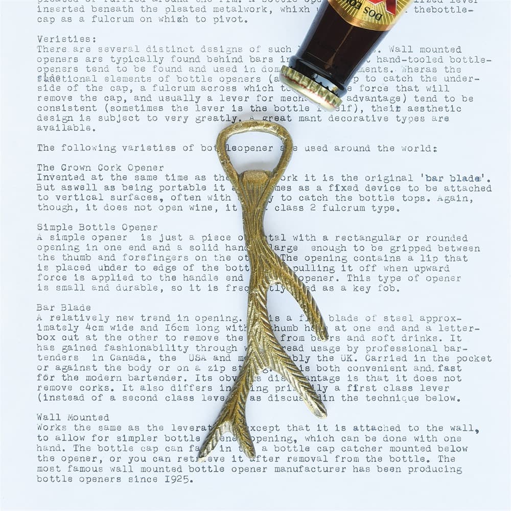 A classic article of daily use transformed into a fun way to pop the top of your favorite bottle. Cast of iron and plated in brass.