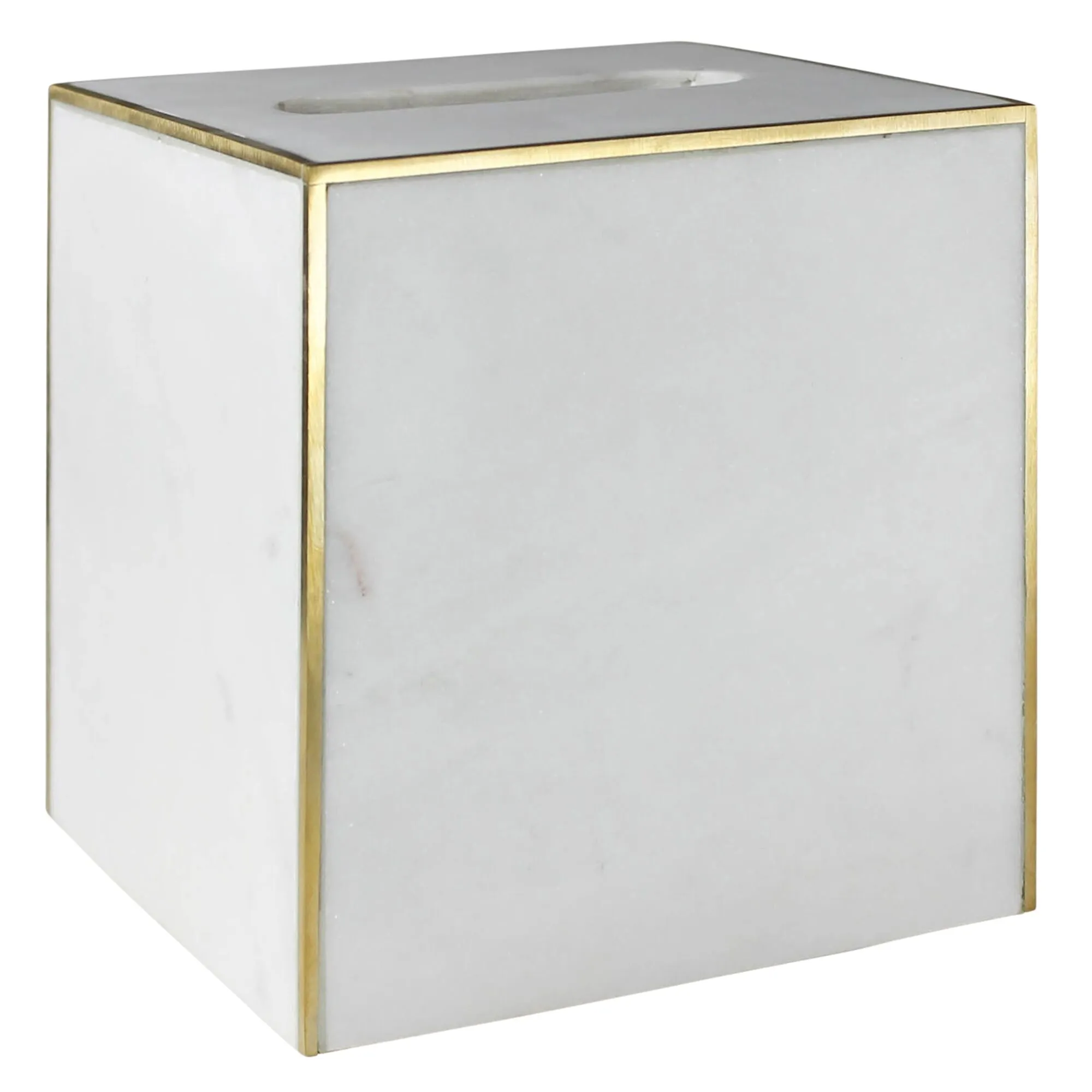 Subtly mottled white marble is paired with a bright brass edge in this tissue box holder, creating a handsome addition for a bathroom collection.