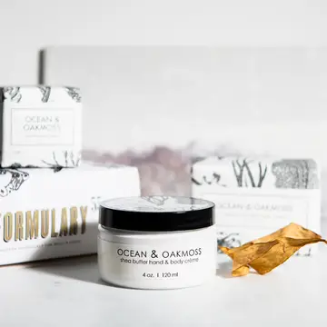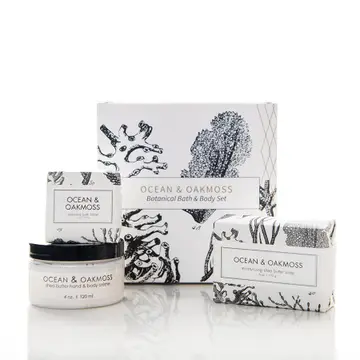 The perfect pampering trio! Ocean & Oakmoss Botanical Gift Set. Packaged in our beautifully designed botanical boxes. Unisex fragrance. Dive into the invigorating essence of Ocean & Oakmoss, a captivating fragrance that combines the freshness of sea spray with the earthy richness of oakmoss, accented by a tantalizing blend of spices and vibrant orange zest. The set includes one of each of the following…. Shea Butter Bath Bar (6oz bath bar size) Shea Butter Hand & Body Creme (4oz jar) Sparkling Bath Tablet (2x2x2 cube) All of Formulary 55 products are made in the USA, vegan, certified cruelty-free, SLS-free, and paraben free.