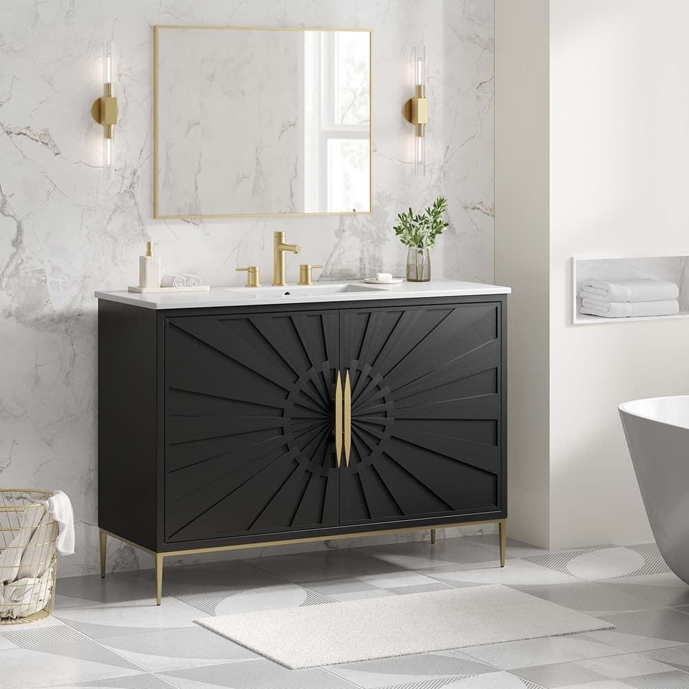 Intricate modernity radiates into your bathroom space with the Awaken 48″ Bathroom Vanity. Showcasing clean lines arranged in a radial formation, this bathroom vanity is crafted with solid wood and MDF and rests on a gold base with non-marking foot pads to protect flooring. This vanity is a complete addition to a bathroom with a ceramic sink basin with an integrated countertop and 8″ widespread holes. Offering ample storage space for bathroom essentials and more, this vanity cabinet features spacious shelves hidden behind detailed doors with sleek gold hardware. Fixtures not included. Assembly required.