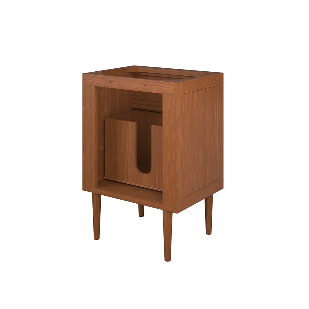 Bring mid-century inspiration and organic tropical aesthetics into any bathroom space with the Cassia 24″ Bathroom Vanity Cabinet. Featuring a clean-lined design and brass metal hardware, this vanity is durably crafted from solid teak wood with a faux top drawer for added interest. Raised off the ground by retro tapered legs, this bathroom vanity cabinet features ample storage in its spacious bottom drawer, complete with a convenient cut-out to accommodate plumbing. Includes non-marking foot caps. Assembly required. Sink basin and fixtures not included. Weight Capacity: 187 lbs.