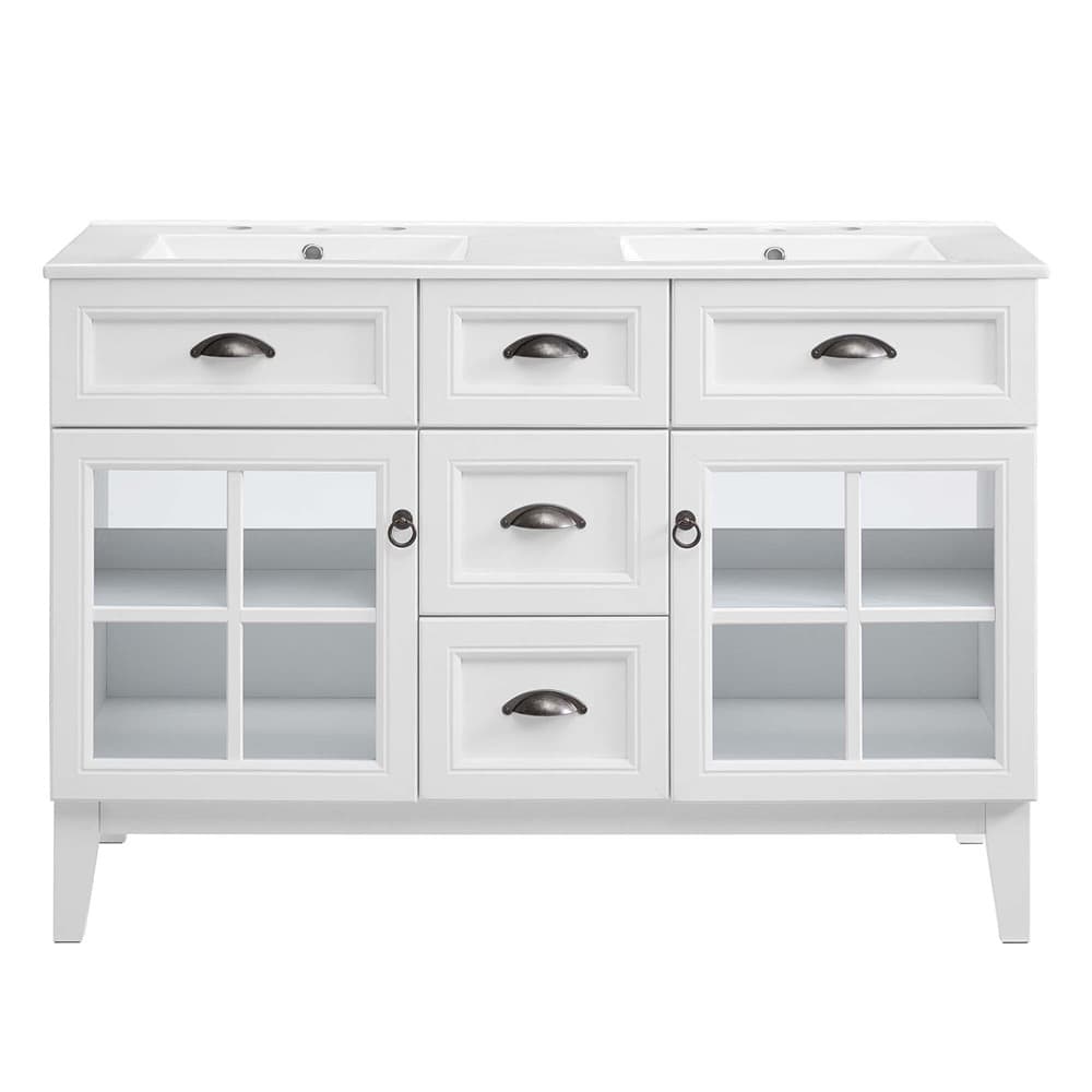 Invite the provincial charm of the Isle 48″ Bathroom Vanity Cabinet to transform your bathroom space. Made of sturdy particleboard and MDF, Isle’s coastal contemporary design features two fixed drawers, three center drawers, and an adjustable shelf for under-sink storage behind two glass windowpane doors. Dual curved ceramic sink basins with an integrated countertop and 8″ widespread faucet holes bring stylish functionality to this bathroom vanity. With a solid construction, this bathroom vanity cabinet brings contemporary design and coastal style to your bathroom space. This double sink has 8″ between basins and 24″ between basin sink holes. Assembly required and fixtures not included.