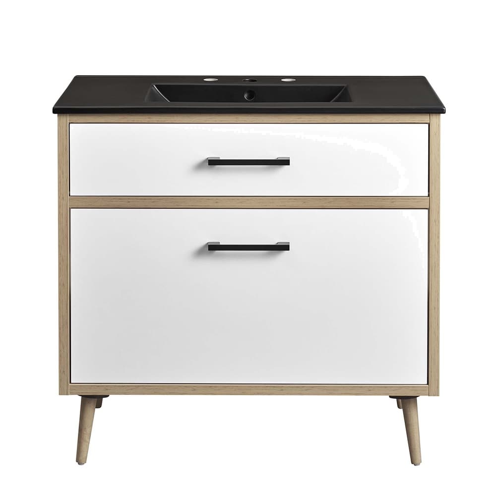 The Maverick 36″ Bathroom Vanity is the perfect blend of modern style and convenience. Crafted with particleboard and melamine, the simple yet elegant design is enhanced by modern metal handle pulls and tapered and splayed rubberwood legs. The spacious full-glide bottom drawer provides plenty of storage space for all your bathroom essentials, while the fixed top drawer adds complementing style. This bathroom vanity cabinet features a ceramic sink basin with an integrated countertop and 8″ widespread faucet holes. This bathroom vanity instantly transforms your space, creating a beautiful, modern look that will last for years. Includes non-marking foot glides to protect flooring. Assembly required. Fixtures not included.