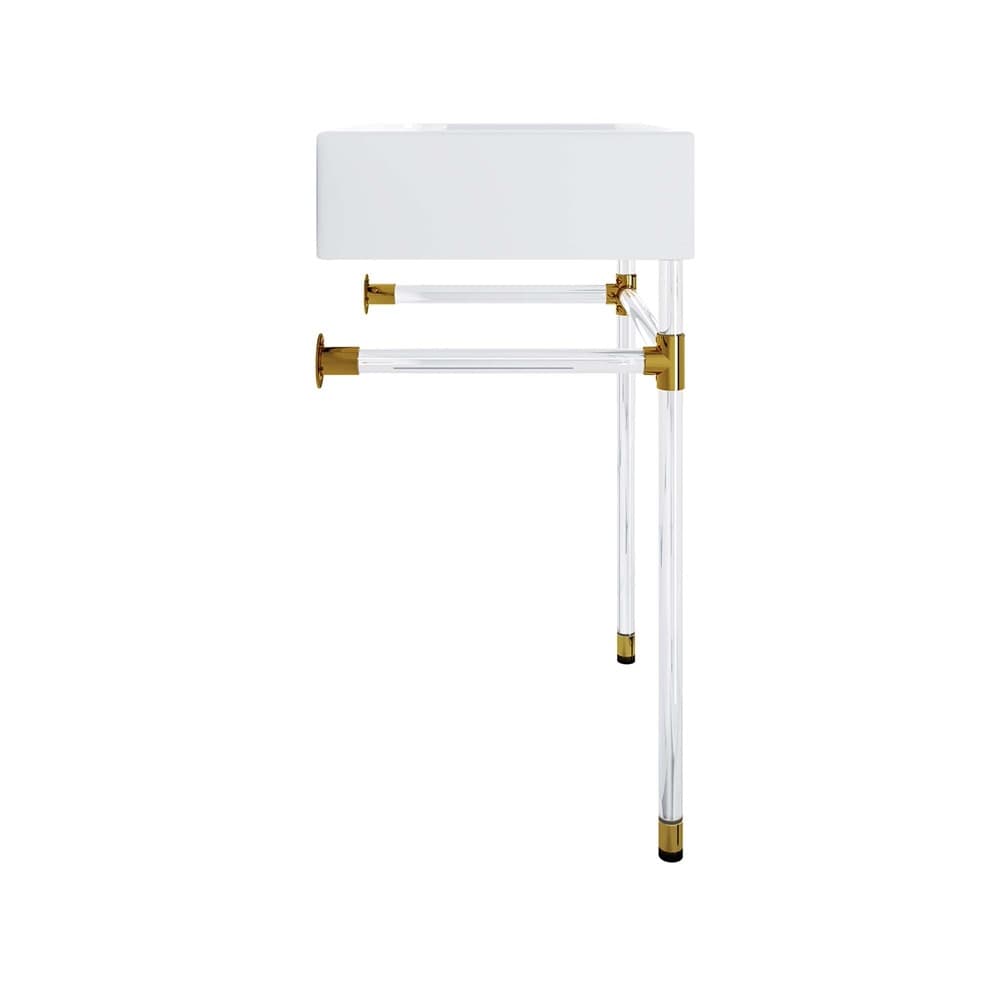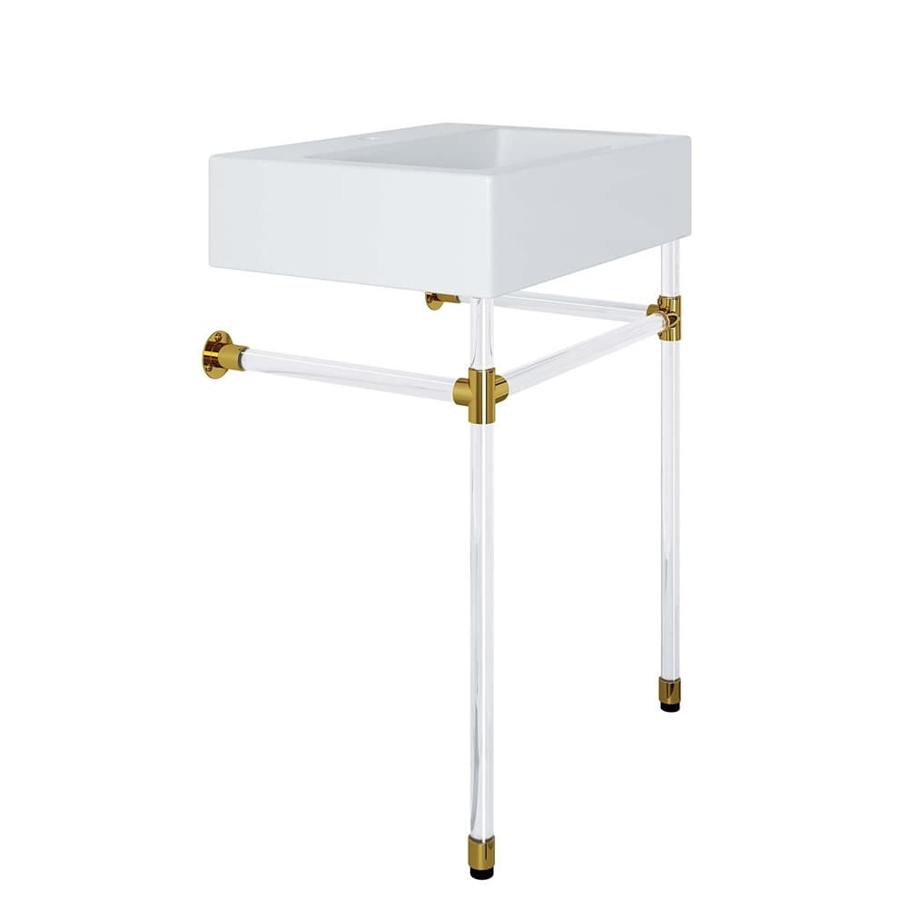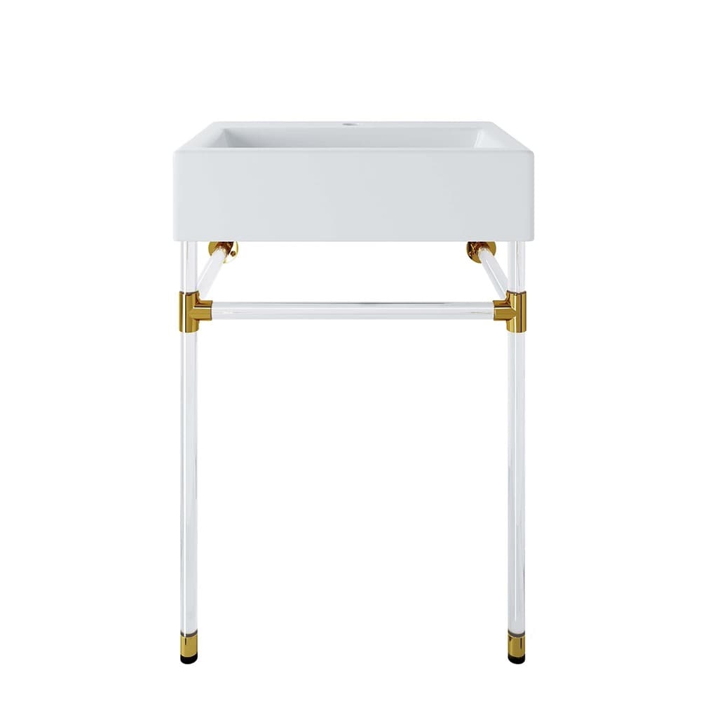Create a bathroom oasis with the minimalist style and efficiency of the Redeem Wall-Mount Acrylic Bathroom Vanity. The glossy white ceramic sink basin and streamlined acrylic frame affix directly and securely to the bathroom or powder room wall. Redeem dispenses gentility in spaces large and small, resting confidently on a sturdy acrylic frame with gold joints for added stability. This small bathroom vanity has a single faucet hole and is outfitted with non-marking foot caps to protect your bathroom floor. Assembly required and fixtures not included.