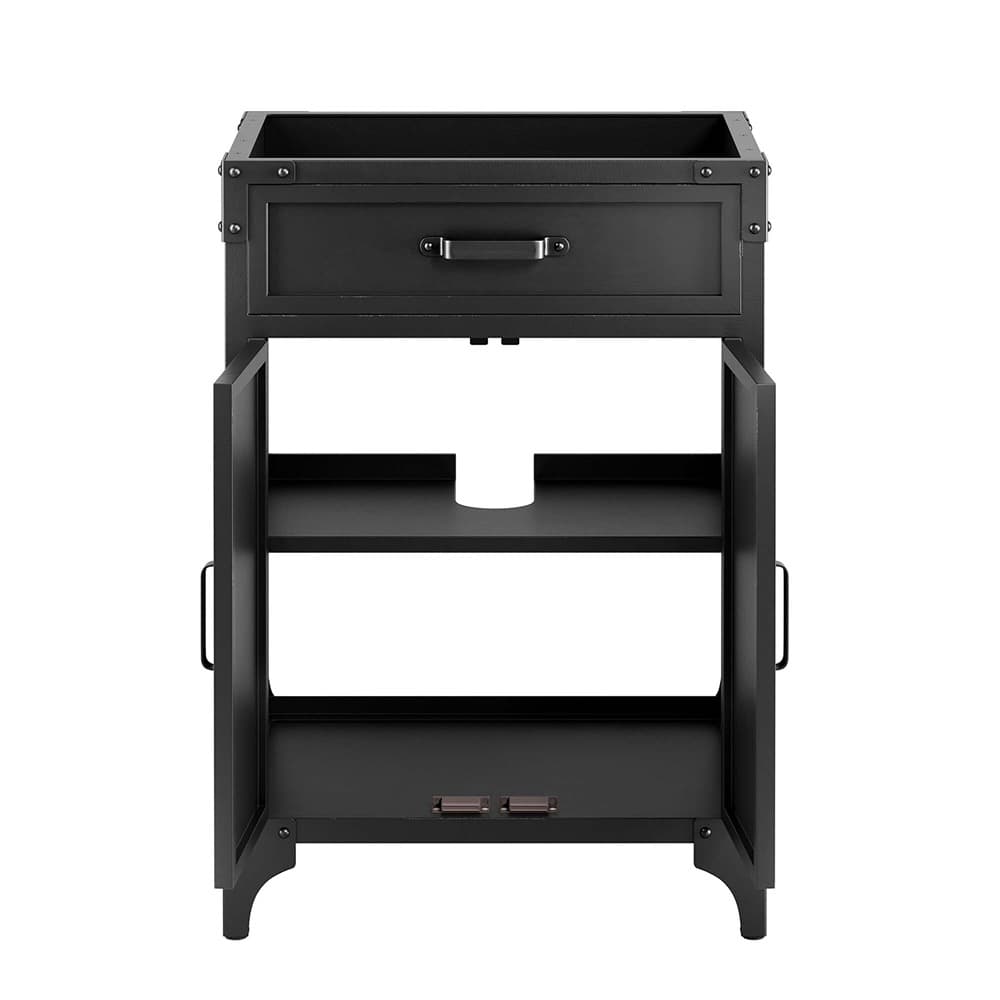 Experience the perfect blend of functionality and industrial modern style with the Steamforge 24″ Bathroom Vanity Cabinet. Crafted from sturdy metal with an antique patina and MDF with a beautiful wood grain veneer, this bathroom vanity cabinet brings a touch of utilitarian elegance to your bathroom decor. With a fixed drawer, pivot hinges, and spacious shelving complete with a plumbing cutout, this vanity provides ample storage space for all your bathroom essentials. With non-marking foot pads to protect your flooring, this bathroom vanity offers the ideal balance of design and practicality. Sink basin and fixtures not included.