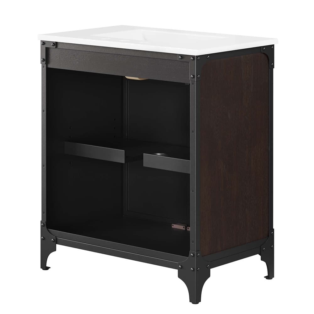 Experience the perfect blend of functionality and industrial modern style with the Steamforge 30″ Bathroom Vanity. Crafted from sturdy metal with an antique patina and MDF with a beautiful wood grain veneer, this bathroom vanity cabinet brings a touch of utilitarian elegance to your bathroom decor. With pivot hinged double doors and spacious shelving complete with a plumbing cutout, this vanity provides ample storage space for all your bathroom essentials. The ceramic sink basin boasts an integrated countertop with 8″ widespread holes, ready for your chosen fixtures (not included). With non-marking foot pads to protect your flooring, this bathroom vanity offers the ideal balance of design and practicality.