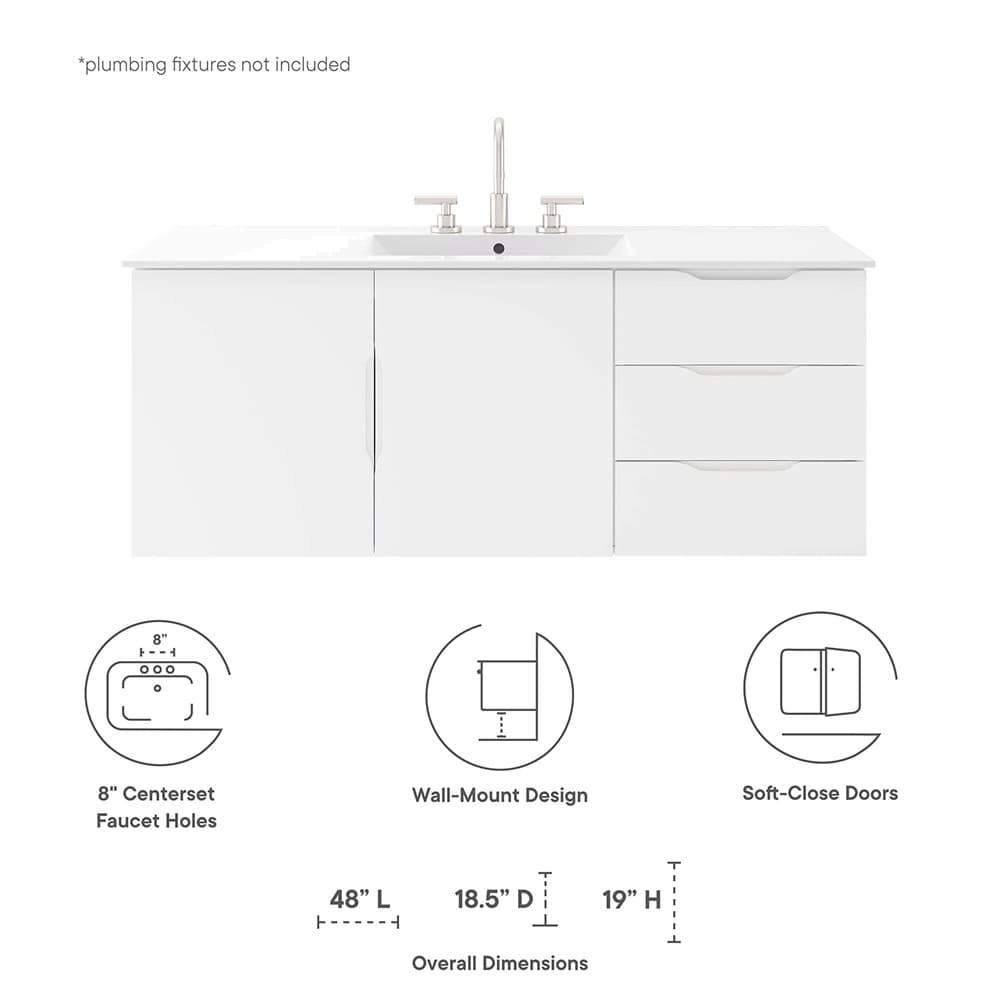 Energize your bathroom space with the modern design of the Vitality 48″ Wall-Mount Bathroom Vanity. Boasting a sleek, clean-lined silhouette, this vanity is durably crafted with particleboard and MDF with a melamine finish. This vanity features a wall-mount design and is complete with ample storage space for all your bathroom essentials with two spacious drawers and an under-sink storage area behind two soft-close doors. This vanity is complete with a ceramic sink basin with 8-inch widespread holes and an integrated countertop. This vanity boasts an open back to accommodate plumbing. Fixtures not included. Assembly required.
