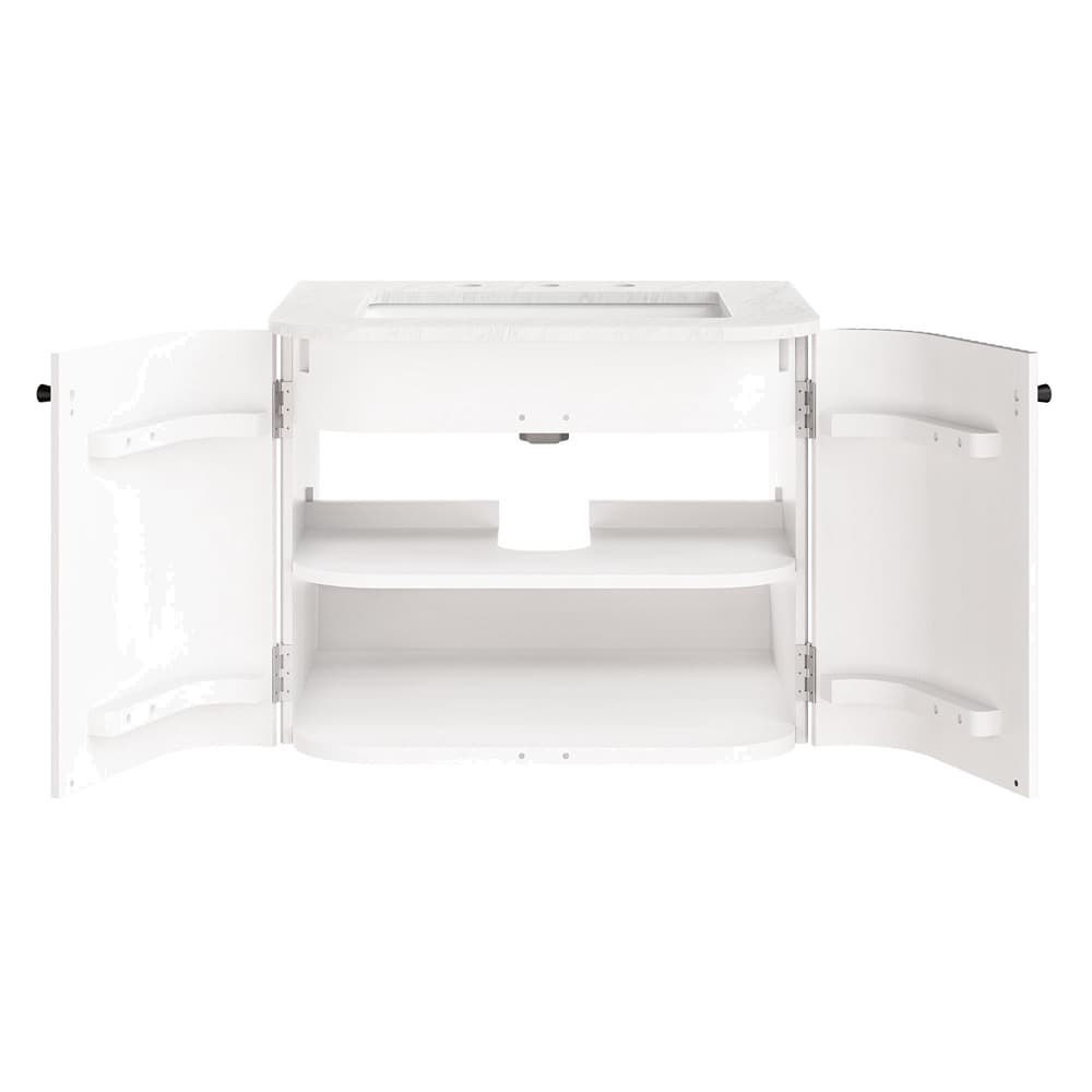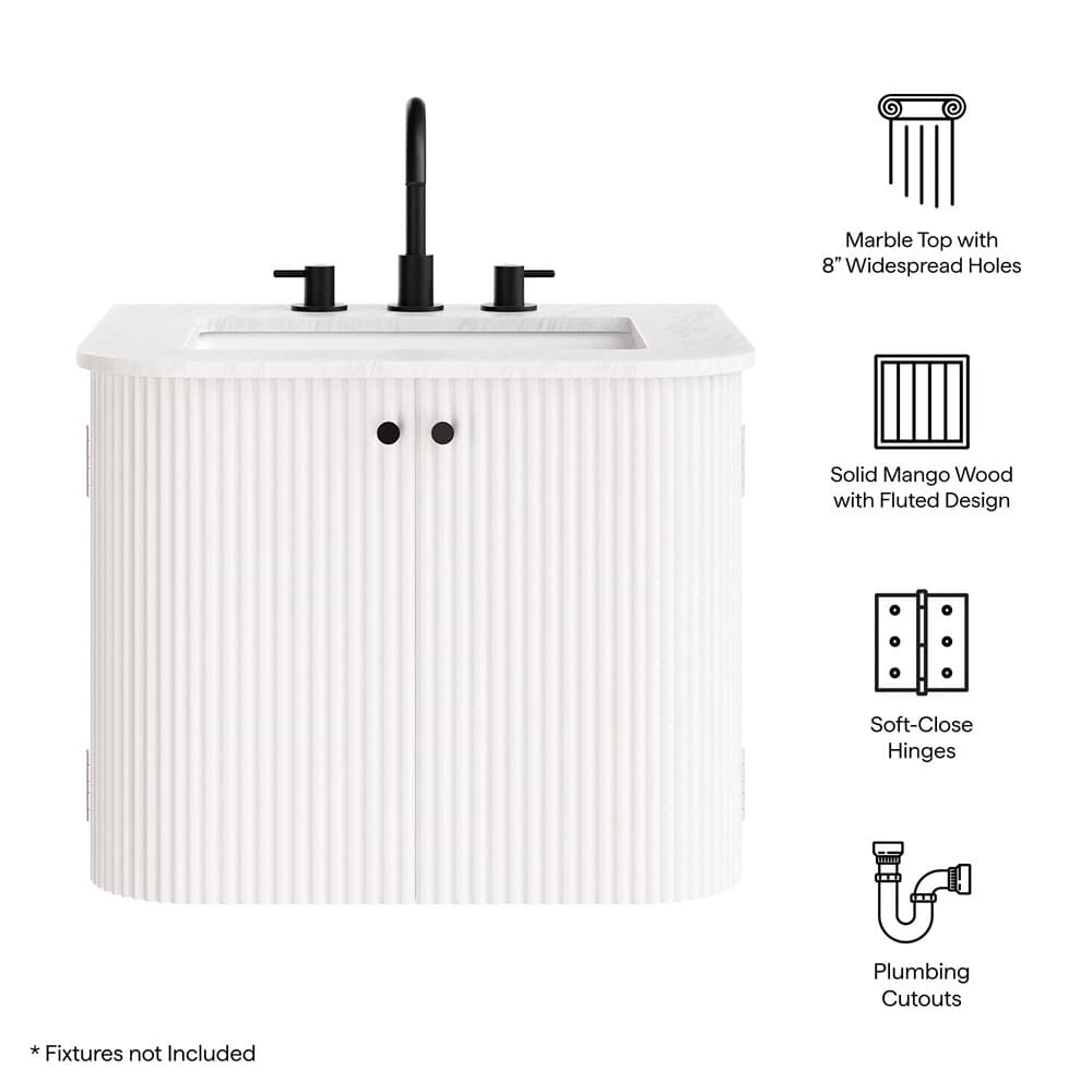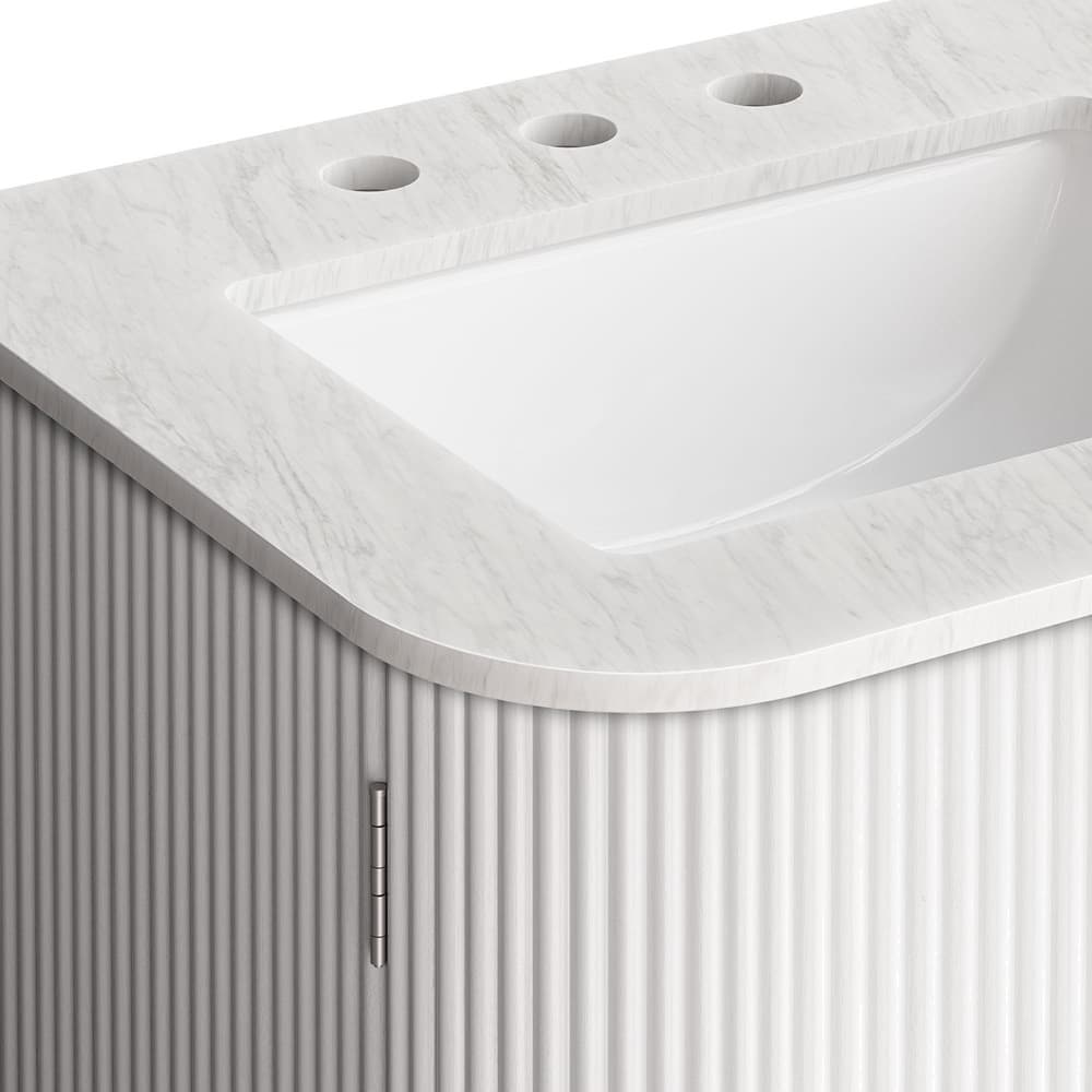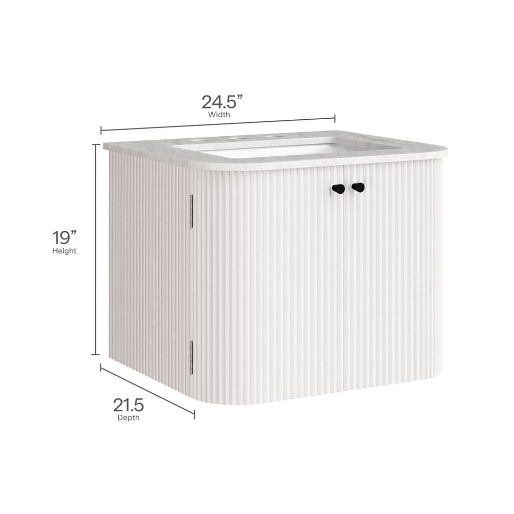 Give your bathroom a modern upgrade with the Zia 24″ Wall Mount Vanity. Its floating, wall-mounted design opens up the space, creating a light and airy feel. The solid wood base features a textured fluted pattern, with deep vertical grooves that add both visual interest and a touch of depth. The marble sink top, complete with a curved basin and three 8″ widespread faucet holes, gives you plenty of options for a faucet that suits your style. Inside, two soft-close hinged doors reveal adjustable shelves for convenient storage, and cutouts for plumbing ensure a seamless installation. The Zia Modern Bathroom Vanity with Sink effortlessly blends modern design with everyday function, bringing timeless beauty and chic practicality to your bathroom. Assembly is required and fixtures are not included. Weight Capacity: 132 lbs.