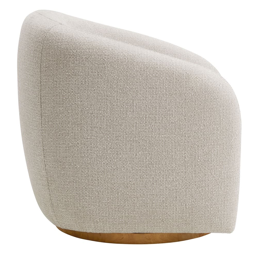 Transform your living space with the Holland Curved Swivel Armchair, where tailored elegance meets modern comfort. Upholstered in a textured chenille-like fabric with boucle-inspired depth, this accent armchair adds a sophisticated, cozy appeal to any room. Better for you and the environment, the upholstery fabric is also OEKO-TEX® STANDARD 100 Certified. The unique curved silhouette, sloping armrests, and soft, rounded edges create a minimalist look that feels both contemporary and inviting. Holland’s generous foam padding, spring coil support, and smooth swivel base offer plush, cloud-like seating with effortless mobility. Resting on a sturdy wood base with non-marking floor glides, this modern curved chair includes one matching ball accent pillow for added style and comfort. Perfect for living rooms, apartments, or offices, the Holland Barrel Swivel Armchair is a statement piece that blends form and function effortlessly. Arrives fully assembled. Weight Capacity: 800 lbs.