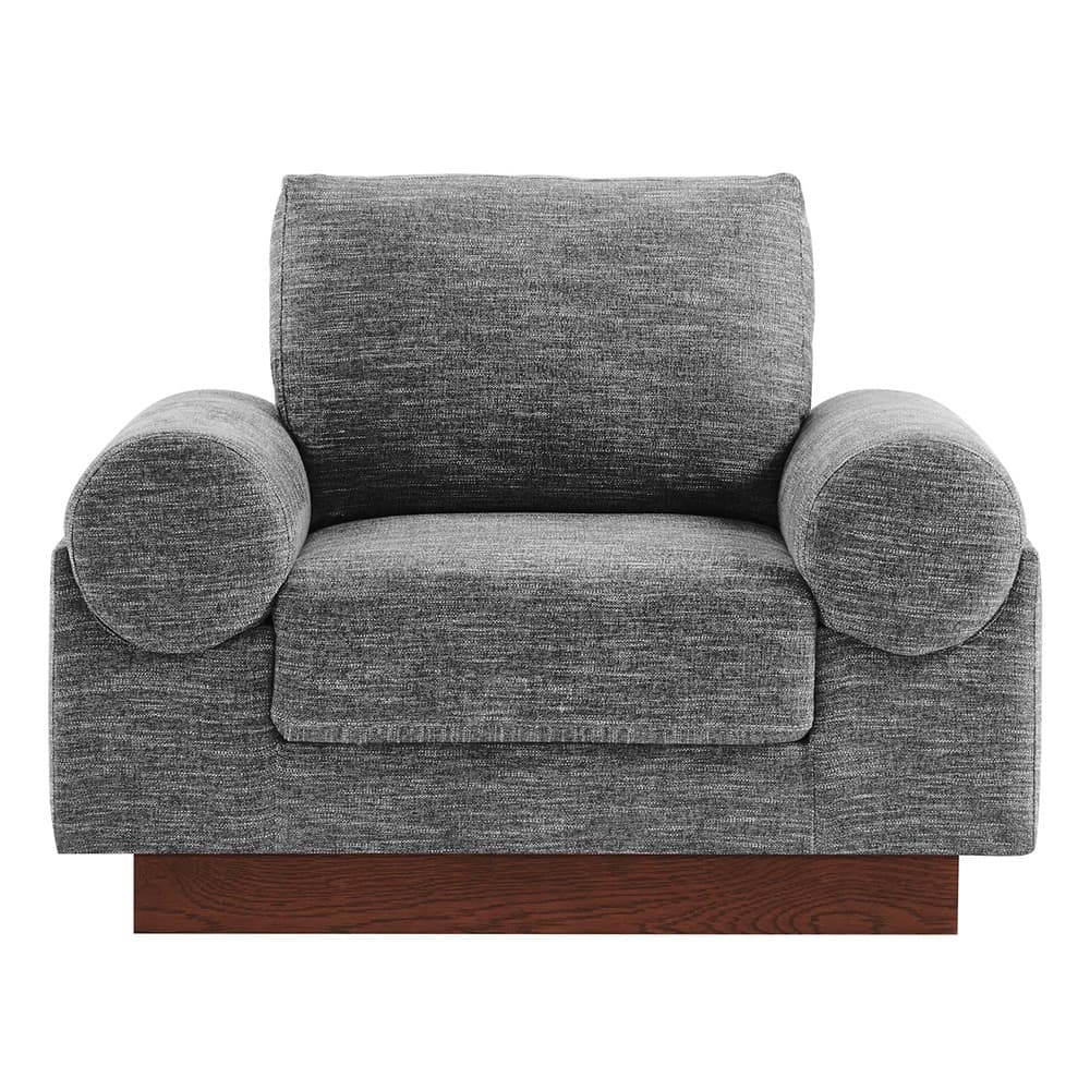 Experience contemporary luxury with the Oasis Fabric Upholstered Armchair infusing modern design and a streamlined silhouette into your living room, lounge area, or office. Showcasing a deep, cozy seat, this comfortable living room armchair offers unparalleled relaxation with armrests that resemble oversized bolster pillows. The dense foam padded cushions with pocket springs provide premium support, while the sinuous spring support system ensures lasting durability. Covered in stain-resistant polyester fabric, this upholstered accent chair exudes elegance while resting on a sturdy wood veneer plinth base. Assembly is a breeze, allowing you to effortlessly incorporate this luxurious accent chair into your home. Enhance your living space with this modern armchair that harmonizes comfort, style, and convenience. Weight Capacity: 200 lbs.