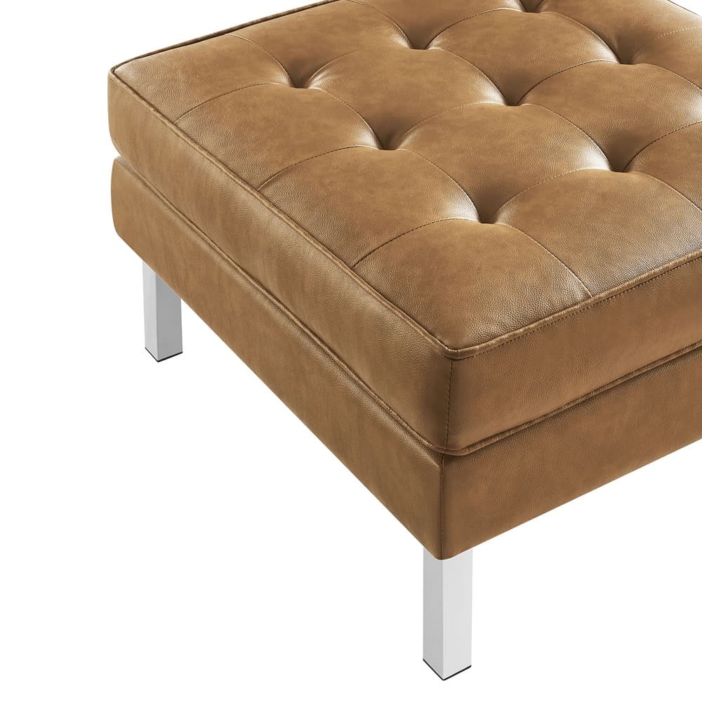 Revolutionize your living room furniture with the iconic Loft Vegan Leather Ottoman. Adding visual depth to your living room or lounge space, Loft features soft and durable vegan leather upholstery accented with classic biscuit tufting. This modern ottoman showcases a captivating linear design, tubular stainless steel legs, and non-marking foot caps that protect flooring. Inspired by the richness of mid-century modern style, this upholstered ottoman is an ideal choice for living rooms, office reception areas, and lounge spaces. Ottoman Weight Capacity: 330 lbs.