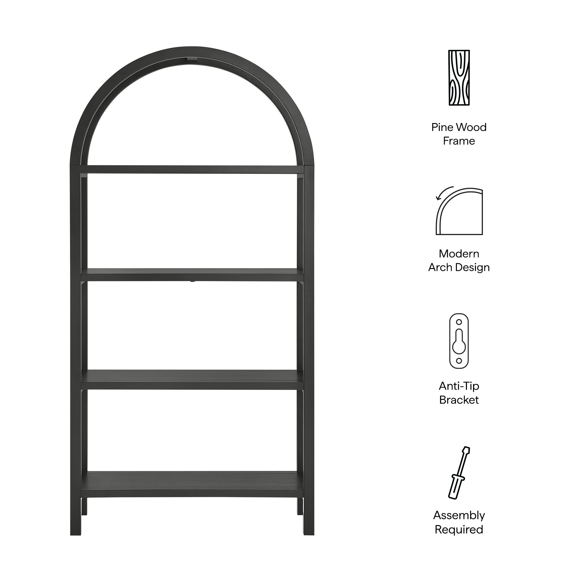 With its sculptural curves and modern take on classic arches, the Vexley Arched Bookshelf brings an artful edge to any space. Ideal for showcasing curated objects, favorite reads, or design-forward accents, this large 72 inch open shelf bookcase plays with negative space and architectural curves, bringing an airy, artful touch to blank walls or creative corners. Built from a pine wood frame and shelves, Vexley offers both strength and style. For added safety, it includes an anti-tip bracket on one of the middle shelves and non-marking glides to protect flooring. A true conversation starter, this arch bookshelf makes a bold statement without visual clutter, blending modern form with effortless display potential. Assembly required. Weight Capacity: 220lbs.