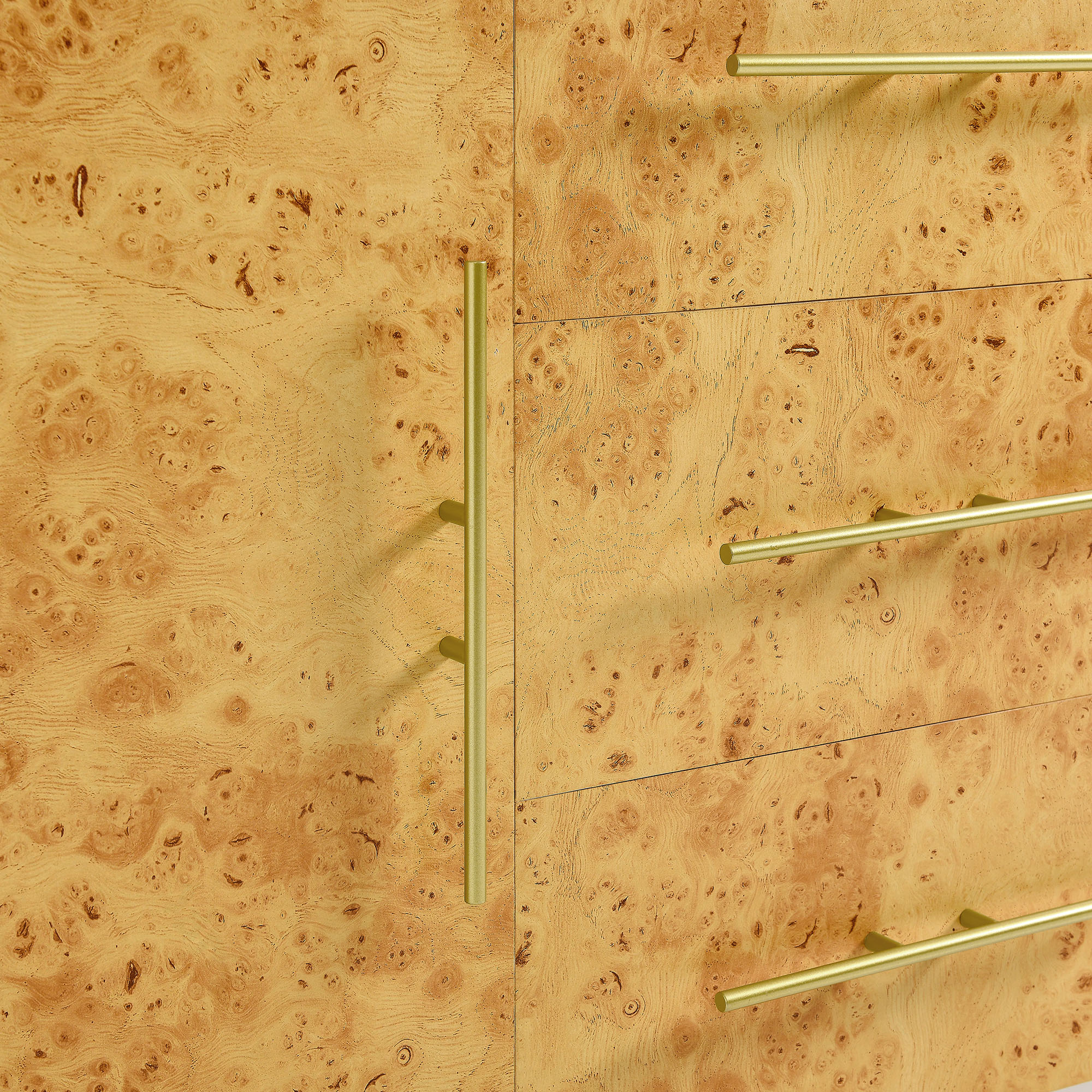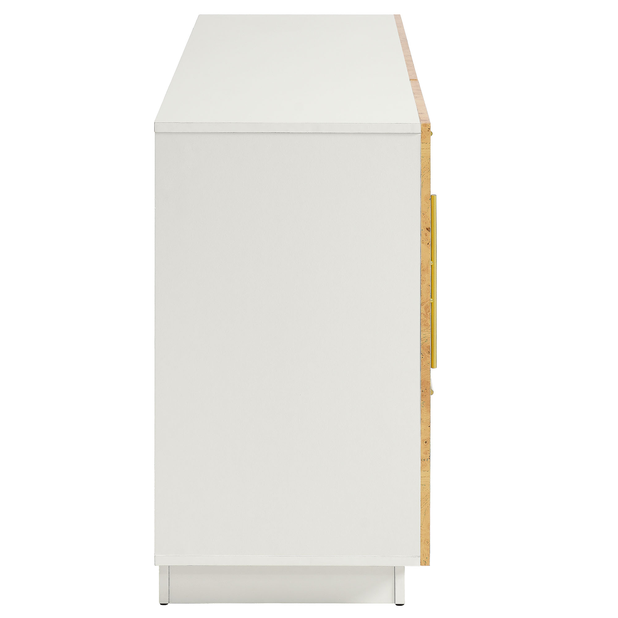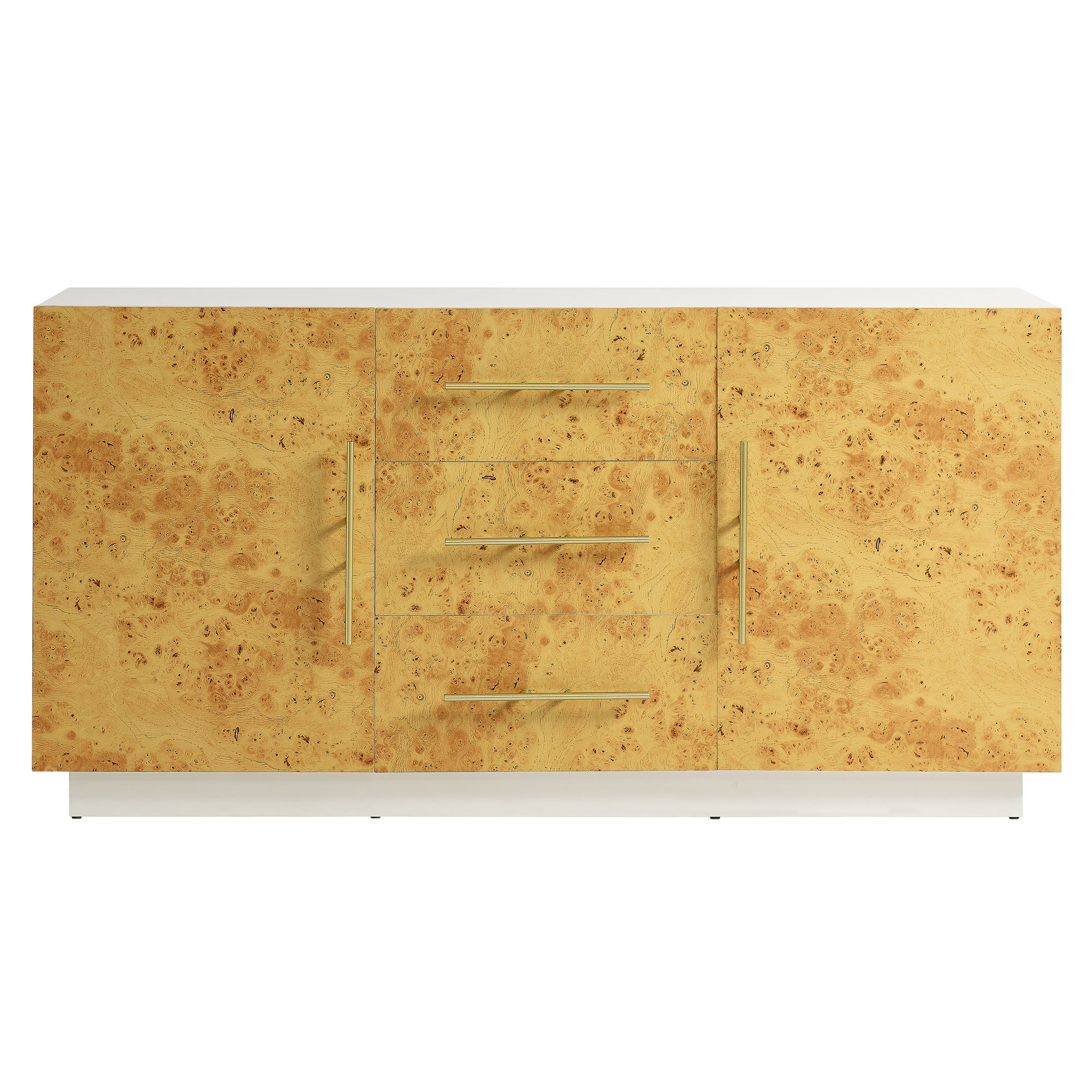 Add a stylish 59 inch storage cabinet to your living room with the eye-catching Abel Burl Wood Sideboard. A perfect blend of mid-century modern design and practical storage, this sideboard cabinet with doors and drawers is crafted from durable particleboard and MDF. Featuring beautifully textured burl wood laminate on its door and drawer fronts, along with elegant gold-tone metal pulls, this sideboard buffet complements both modern and farmhouse-inspired interiors. With soft-close hinges, the two doors and three drawers of the Abel Cabinet Sideboard each open to reveal individual storage compartments, providing stylish storage – whether used in the living room as an entertainment cabinet for anchored or wall-mounted TVs, or as a sideboard buffet cabinet in your dining room. While its burl wood laminate adds a timeless, contemporary design, the spacious compartments of this wood credenza cabinet with drawers ensure your living room essentials are always within reach. Assembly required. Weight Capacity: 287 lbs.