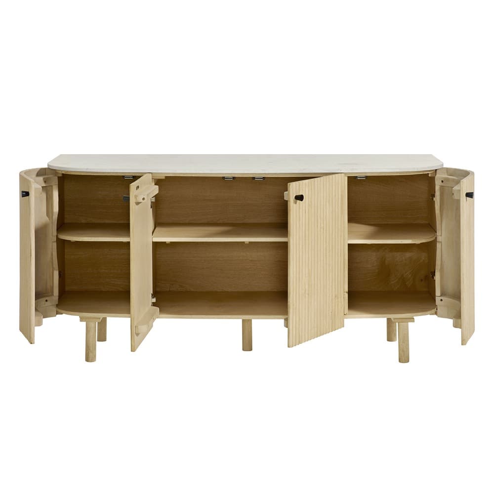 Bring sculptural elegance to your home with the Caldera Curved Sideboard, a seamless blend of natural materials and refined design. Topped with a smooth slab of genuine marble, this 60″ fluted buffet cabinet is crafted from solid mango wood and shaped with soft curves that lend an organic, contemporary presence. Four soft-close doors conceal three generous storage areas, each with an adjustable shelf, making this sideboard a multifunctional solution for the entryway, dining room, hallway, office, or as a stand for wall mounted TVs. From storing serveware and linens to organizing media accessories or bar essentials, the Caldera Storage Cabinet is as functional as it is eye-catching. The vertical fluting and rounded edges offer texture and visual depth, while minimalist black hardware maintains a sleek, modern profile. Designed with non-marking floor pads to protect your surfaces, this statement accent cabinet requires straightforward assembly. Weight Capacity: 200 lbs.