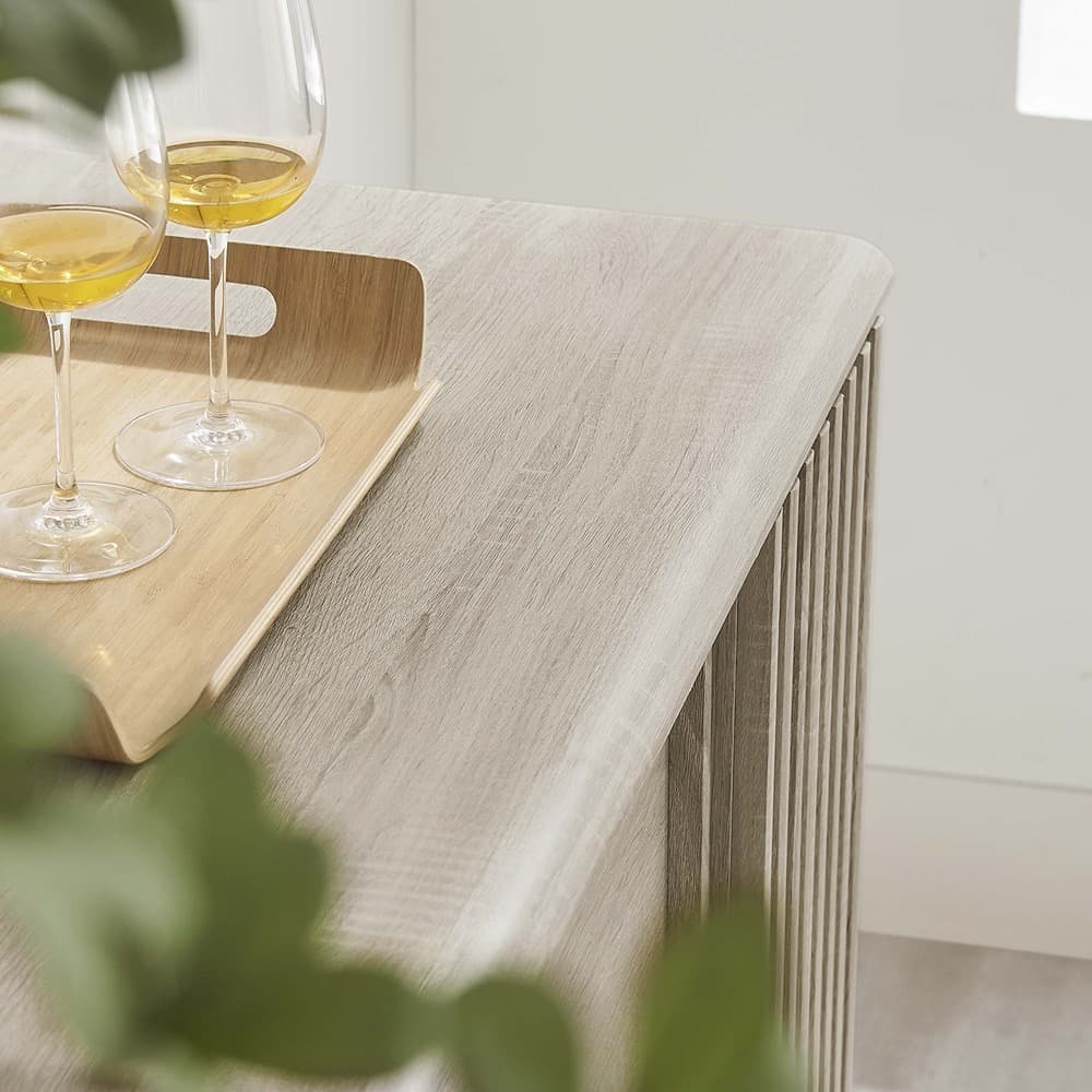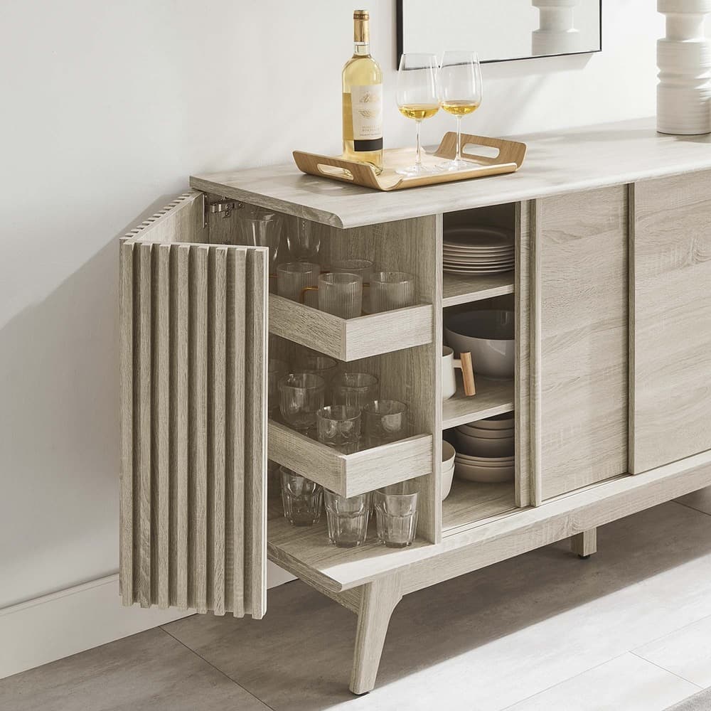 Transform your living space with the Eudora Sideboard. Constructed with MDF and particleboard with a beautiful wood grain design, this sideboard is both stylish and durable. Offering spacious storage in the living room, entryway, dining area, or other living space. This versatile piece can also serve as a high TV stand with its ample storage space for media essentials and cable management holes. Vertical slatting on the sides grants elegant definition to its overall look. The shelving areas are concealed by two sliding doors and hinged corner doors granting more than enough space to store serving pieces, bar essentials, home accessories, and more. The corner storage space can conveniently store remotes, silverware, glasses, barware, and whatever else suits your needs. Bringing mid-century inspiration to the home, its splayed base and non-marking foot pads ensure stability and protect your floors from scratches. Assembly is required, but our easy-to-follow instructions make it a breeze. Weight Capacity: 200 lbs. Please Note: When placing the TV directly on the unit, we recommend anchoring it in place.