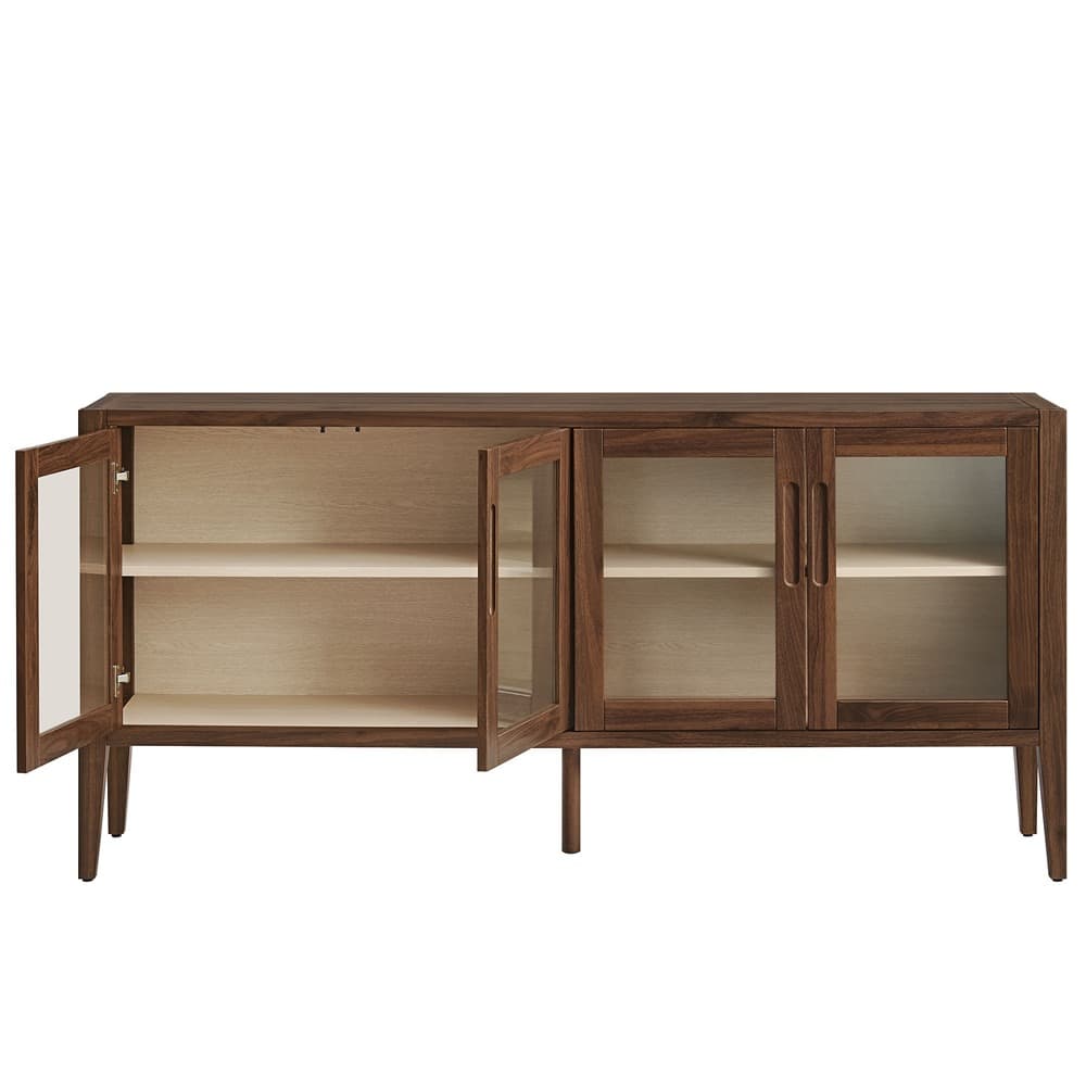 The Nell Sideboard Buffet Cabinet brings a crisp mid-century silhouette and multipurpose design to your living space. This 72-inch buffet sideboard cabinet features four framed tempered glass doors that open smoothly with minimalist finger pull cutout handles. Behind the glass door cabinet, two spacious compartments with adjustable shelves provide flexible storage for everything from dish ware to linens, books, or decorative accents. The wood grain laminate adds warmth to this modern accent cabinet, while its versatile build makes it equally suited as a kitchen buffet cabinet, office credenza storage cabinet, or entryway table with storage. It can also be used as a TV stand for wall-mounted TVs. With clean lines and slightly tapered legs, it’s a refined option for those who love mid century modern furniture. Weight Capacity: 201 lbs.
