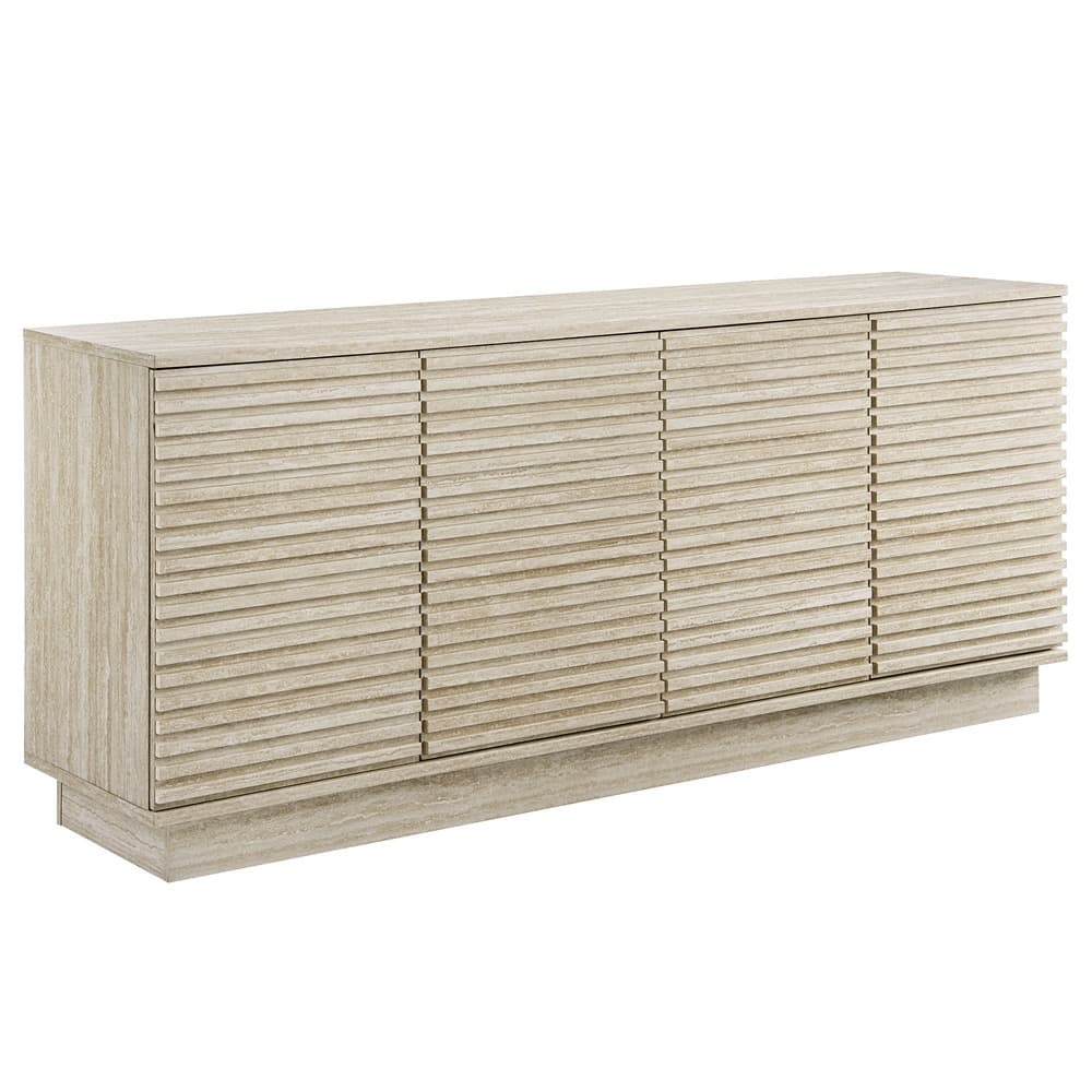Tap into mid-century aesthetics with the Render Sideboard Cabinet Display Stand. Resting on a plinth base, this dining room buffet table features a durable particleboard frame with smooth faux travertine laminate and four slatted doors for easy access to concealed storage with adjustable shelves. The Render cabinet sideboard provides an abundance of storage space for dinnerware, media essentials, decor, and other household items. Boasting a mid-century modern style, this slatted sideboard cabinet features a solid construction with a pleasing look and practical functionality. Perfect as a 4 door slatted sideboard, credenza cabinet, or buffet table with storage, Render also serves as a high TV stand or media console accommodating anchored or wall-mounted TVs. Assembly required.
