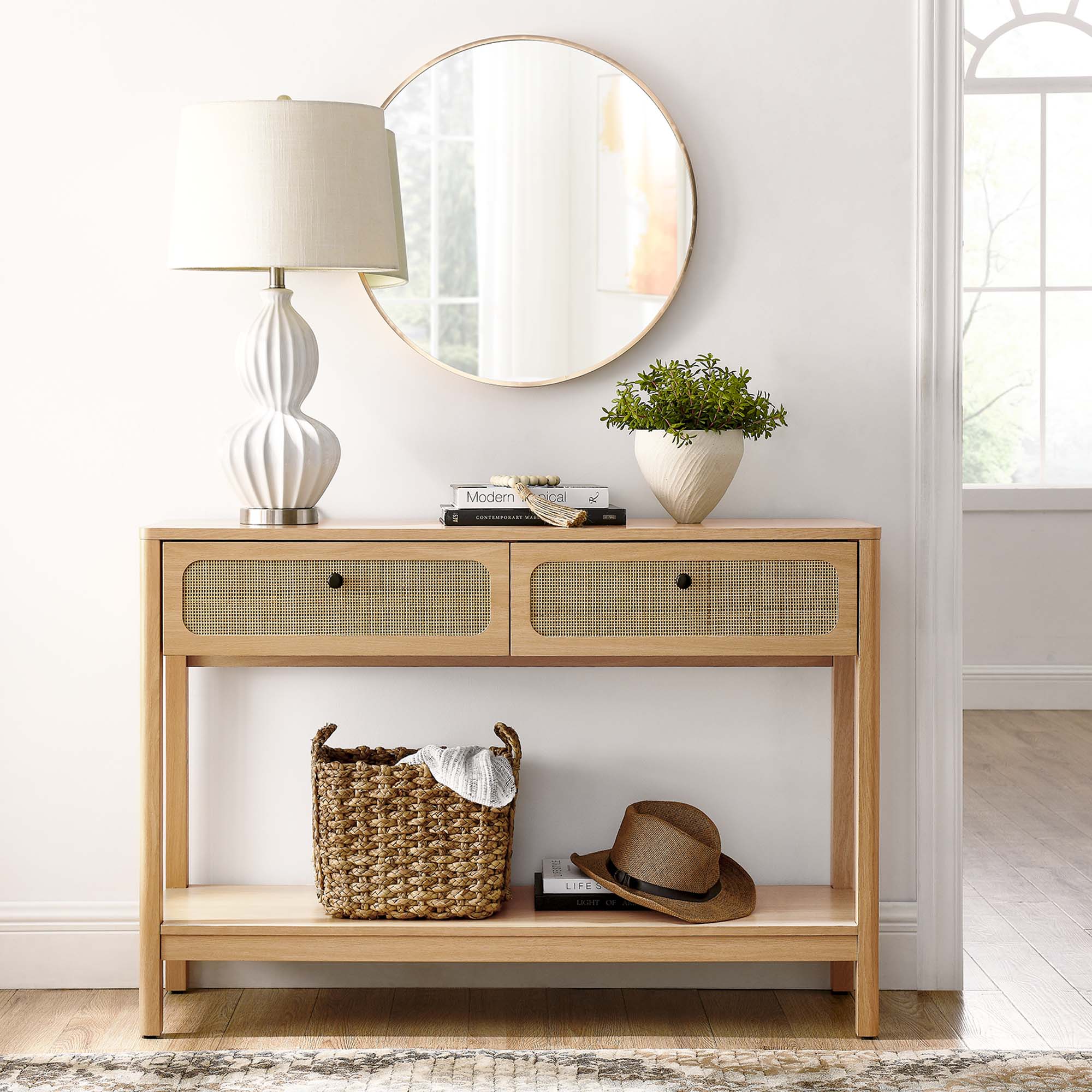 Refresh your living space with the textured detail of the Chaucer Console Table. This versatile piece is not just a stunning entryway table but also doubles as a TV console table in your living room. It features an open bottom shelf perfect for display and two spacious full-glide drawers with metal knobs for concealed storage. Enhanced by the beautiful rattan weaving on its drawers, this hall table instantly updates entryways, hallways, reception areas, or living rooms. Resting on sleek legs with non-marking feet for floor protection, the Chaucer sideboard is durably crafted with particleboard and wood grain laminate to bring natural organic aesthetics to your modern living room decor. Assembly required. Table Weight Capacity: 132 lbs; Shelf Weight Capacity: 132 lbs