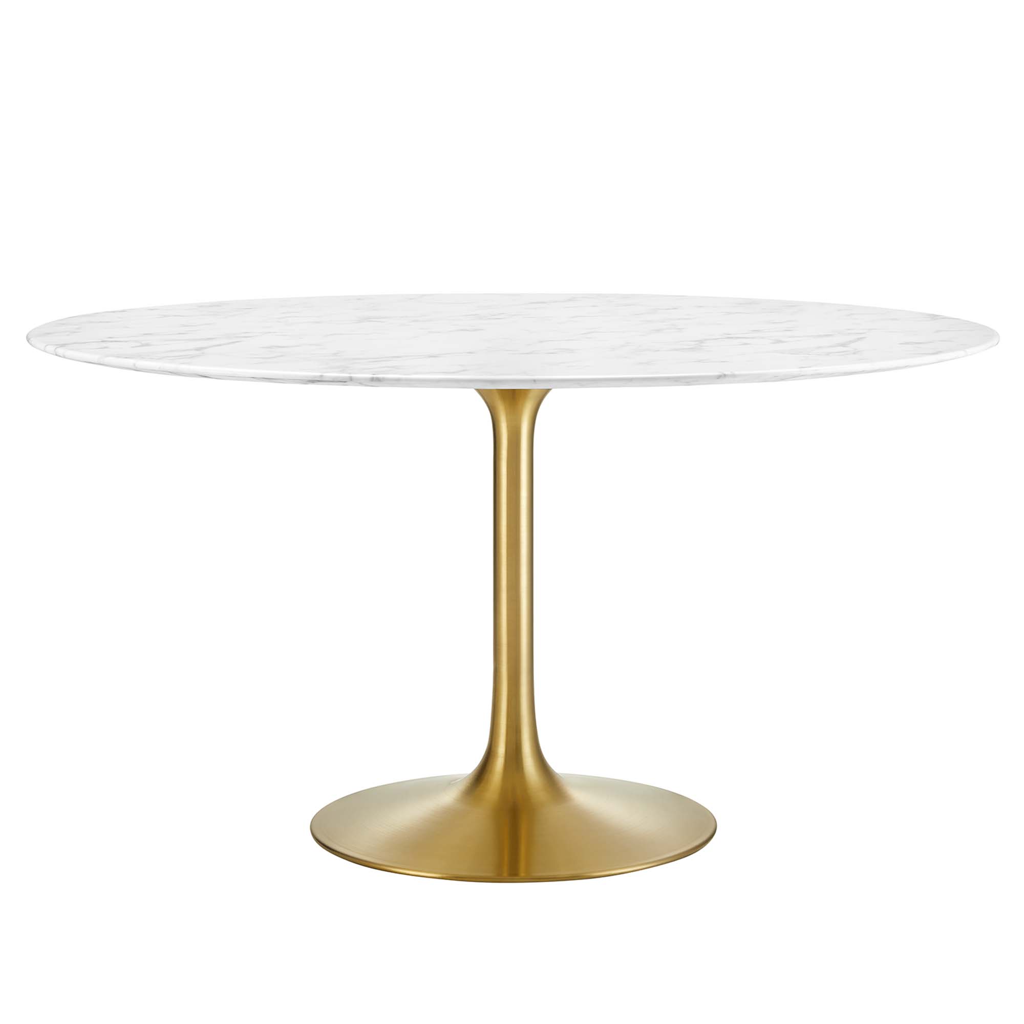 Let modern inspiration flow while gathered around the Lippa 54″ Round Artificial Marble Dining Table. Perfect for entertaining family and friends or everyday dining, this pedestal table comfortably seats four. Its round tabletop is crafted with artificial marble and beveled edge for a contemporary yet timeless design. Embodying an iconic mid-century silhouette, this pedestal dining table floats on a sleek tapered metal base with a chip-resistant brushed gold finish. Includes non-marking felt pad to protect flooring. Assembly required.