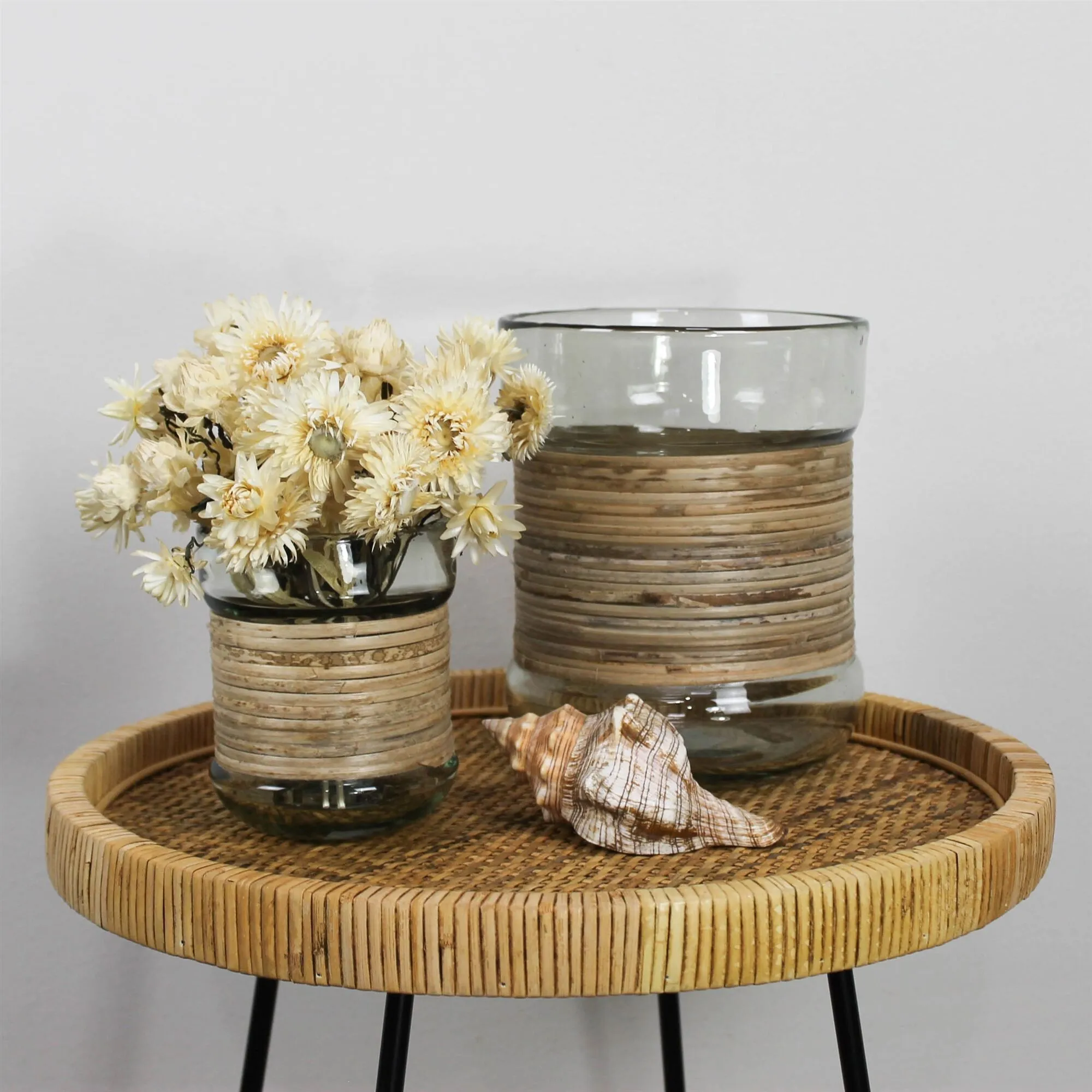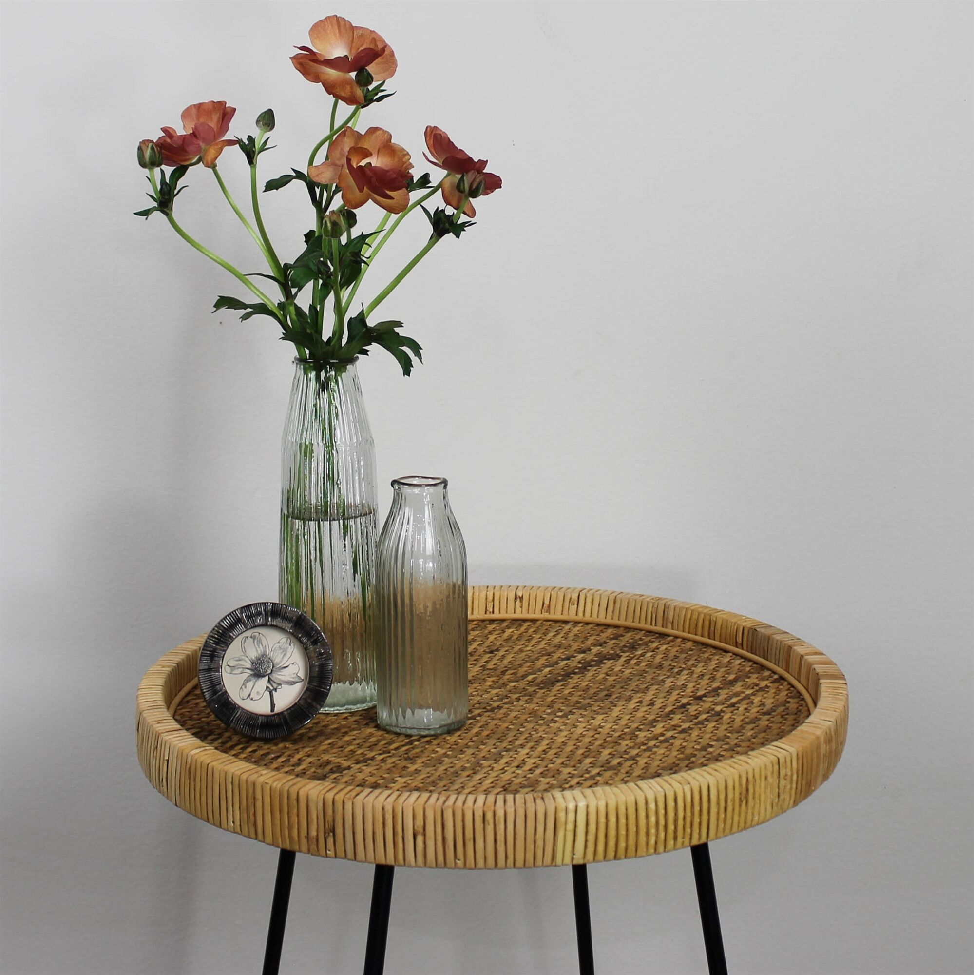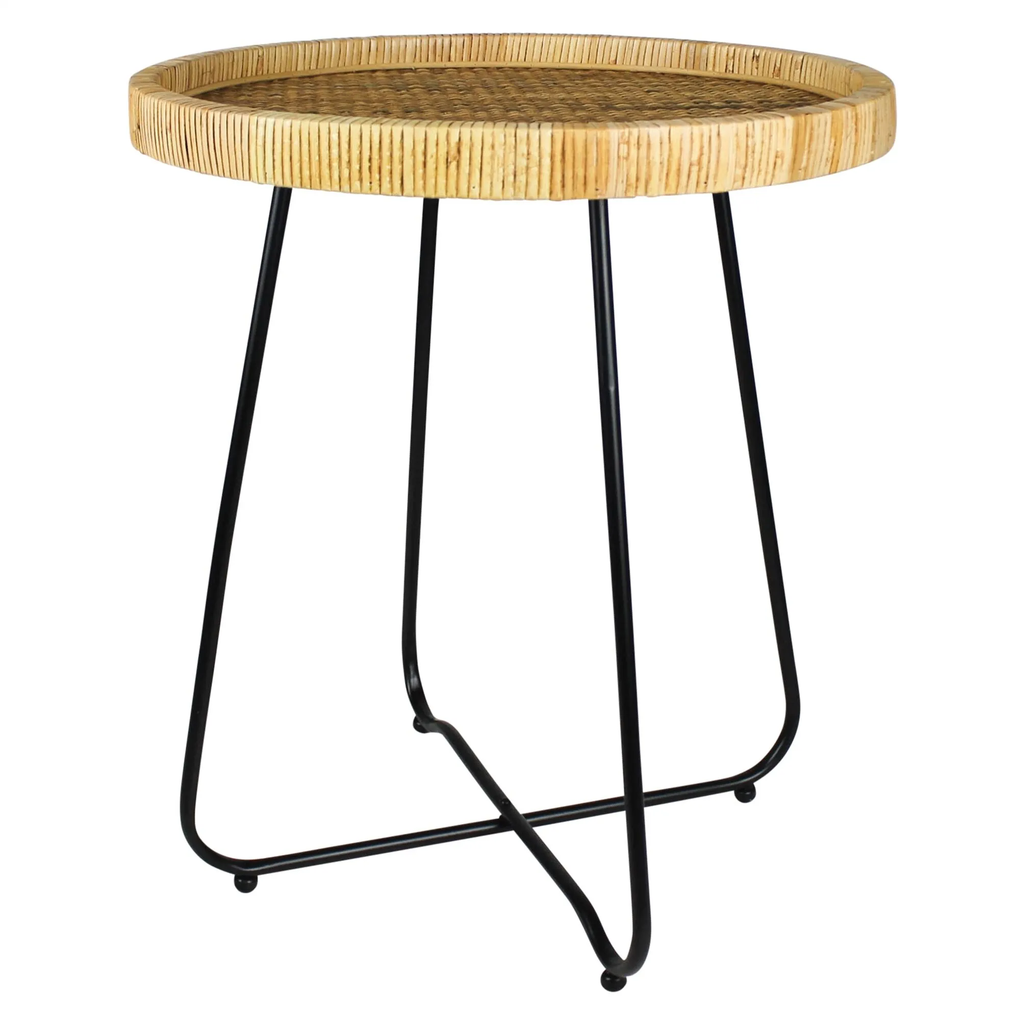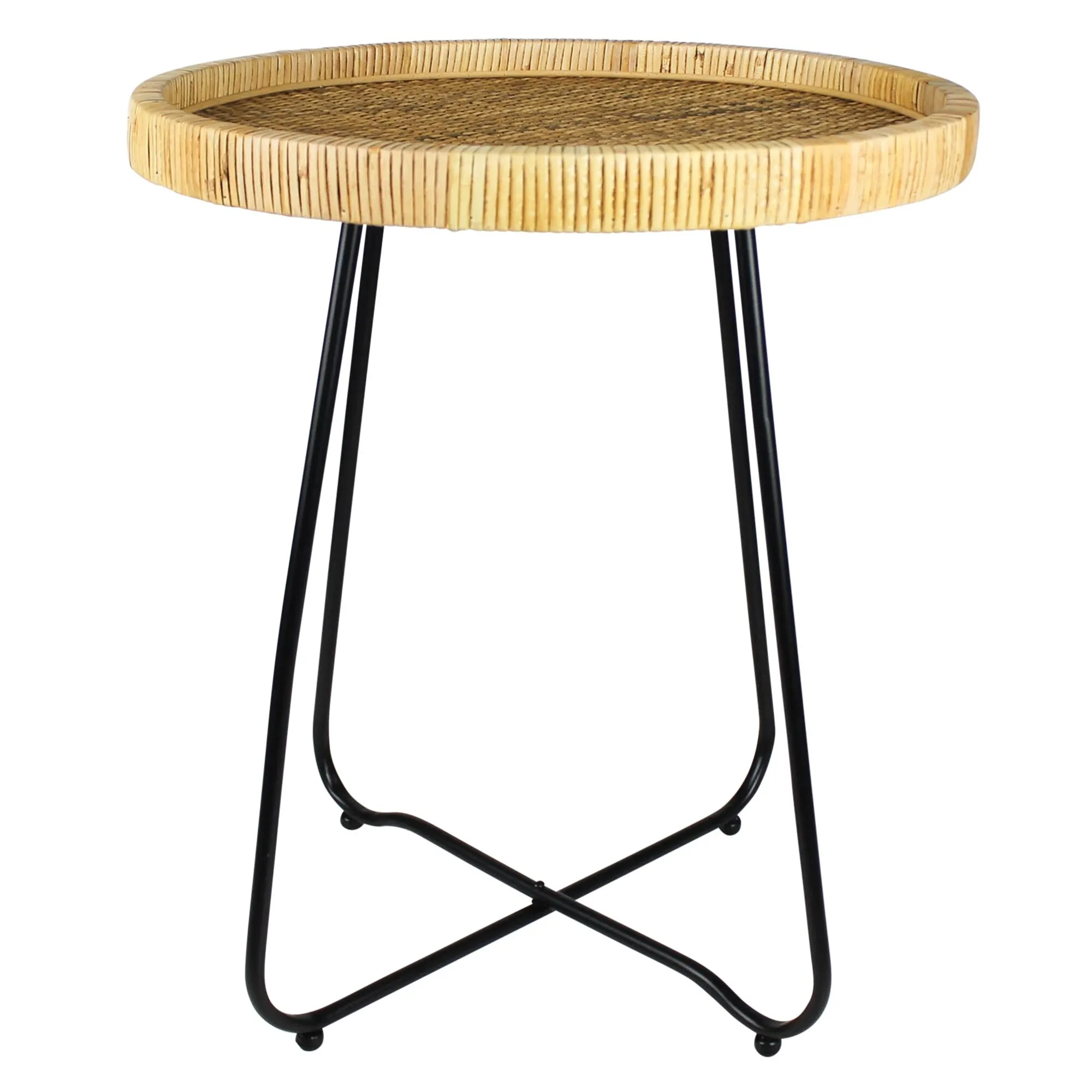 Rattan and metal join to create a versatile side table with a small footprint.