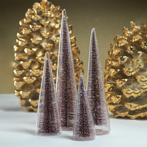 The extra large tree is dark pink with glitter snowflakes and is enveloped in glass.