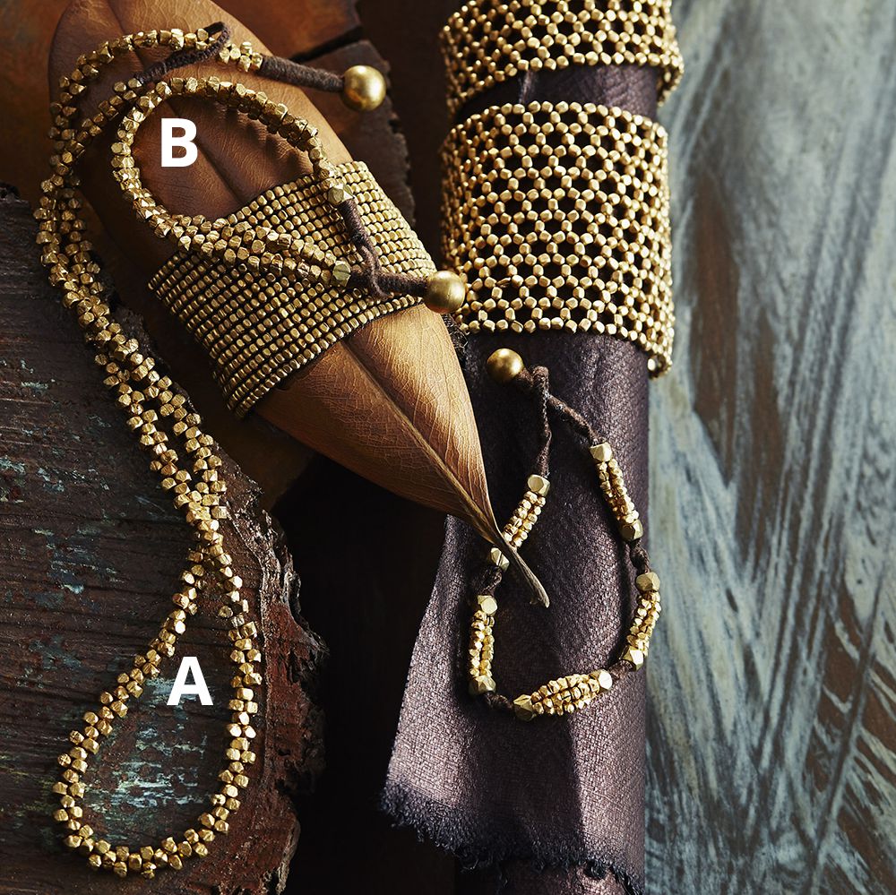Faceted brass tribal beads are hand-strung in a striking mosaic row pattern on dark-brown cotton cord with a decorative ball and loop closure. The long necklace alternates single and double beads, while the bracelet features double and triple rows.