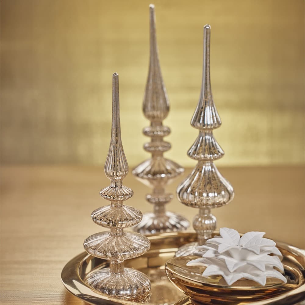 Let there be light this holiday season with these beautiful LED decorative glass tabletop finials. These antique finish finials are lit with warm white LEDs to make a stunning Christmas ornament. It is a perfect way to add fun detail and light to any Christmas tabletop or room.