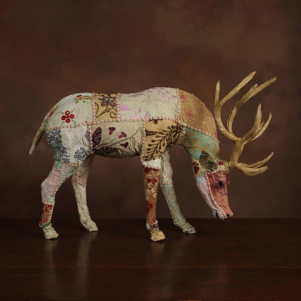 Natural fiber forms are clothed in vintage sari fabric in tones of pale browns and ivory. Each stag will be unique.