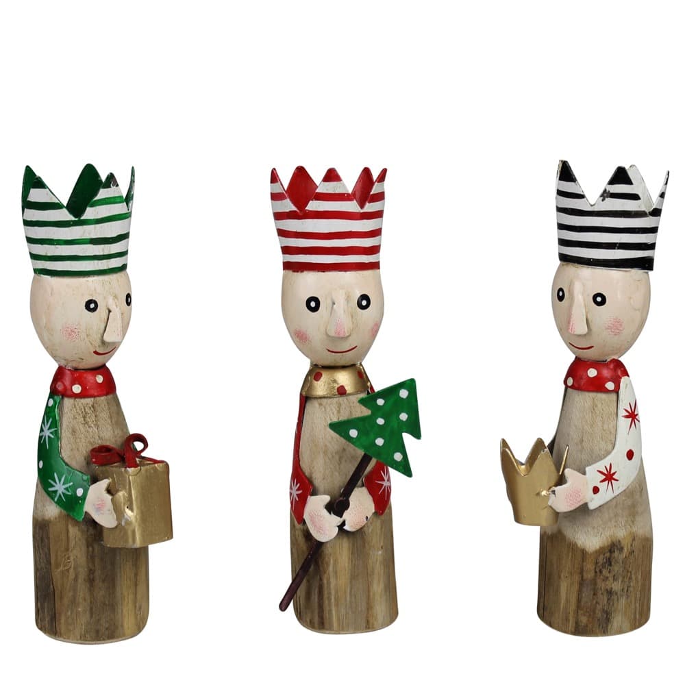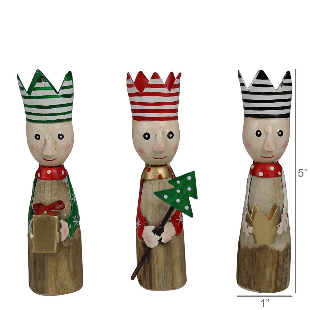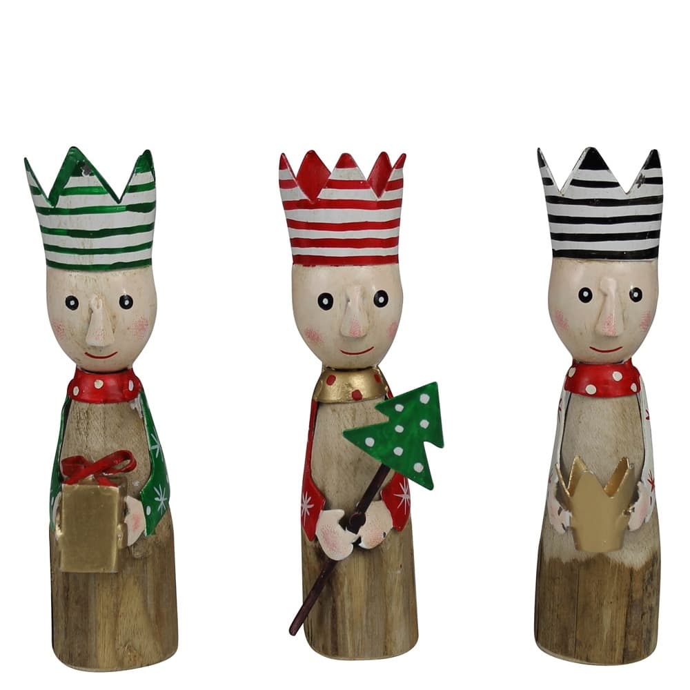 Carved from wood with hand painted metal details this set of 3 festive kings add a touch of sweetness to holiday décor.