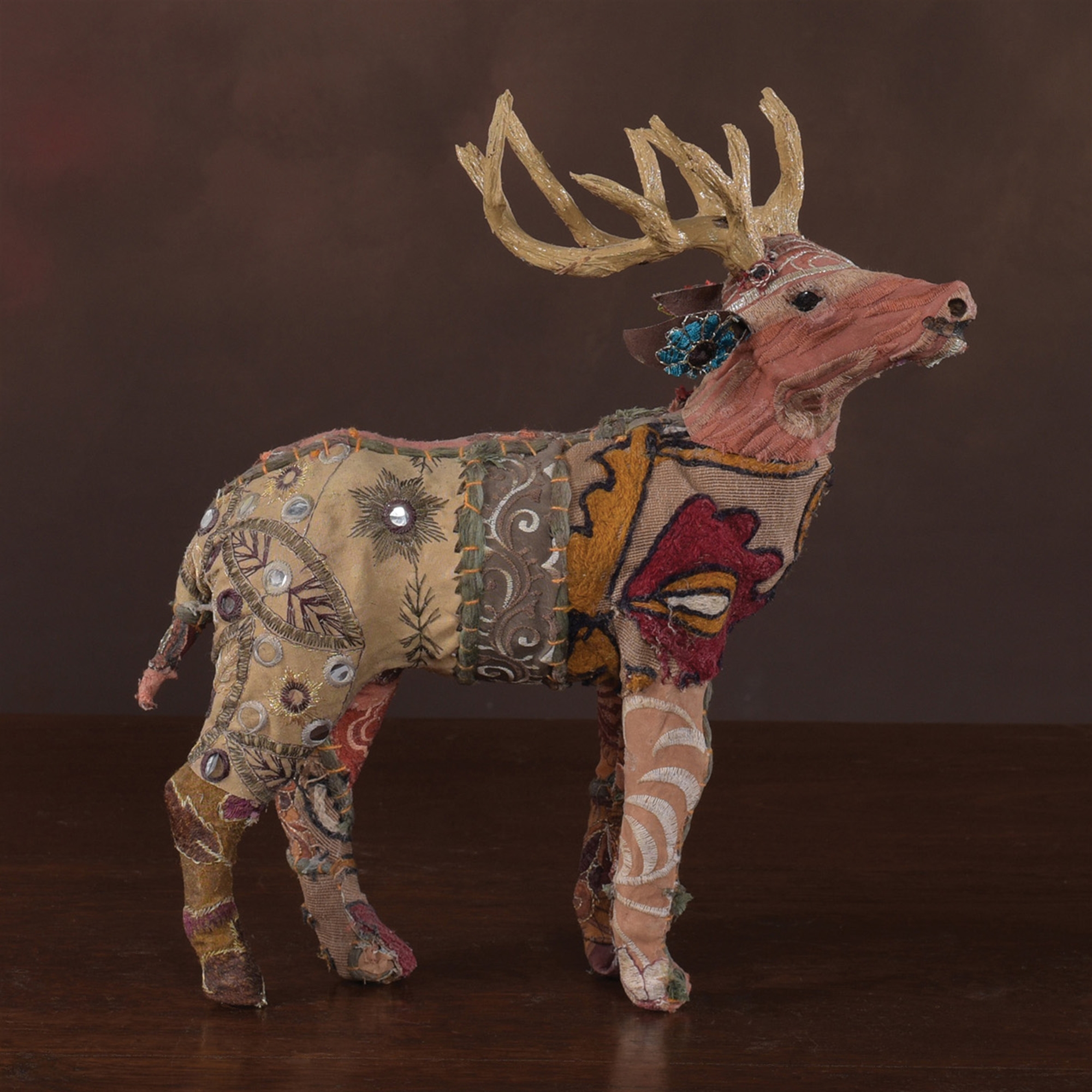 Natural fiber forms are clothed in vintage sari fabric in tones of deep browns and burgundy. Each Stag will be unique.