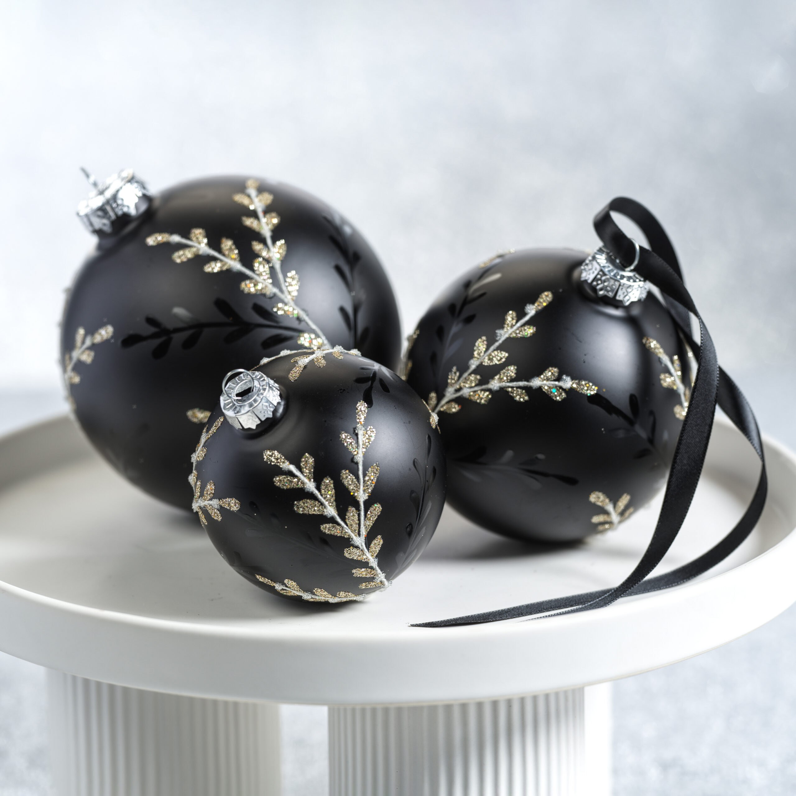 Elevate your holiday décor with our sophisticated matte black glass ball ornaments. Featuring an exquisite leaf pattern design, these ornaments beautifully combine shiny silhouette styles with glittered elements. The leaves are elegantly adorned with silver glitter, while the stems are intricately crafted with white thread, accented by tiny beads and a touch of glitter. Perfect for adding a touch of elegance and sparkle to your festive decorations, these ornaments are a must-have for the holiday season.