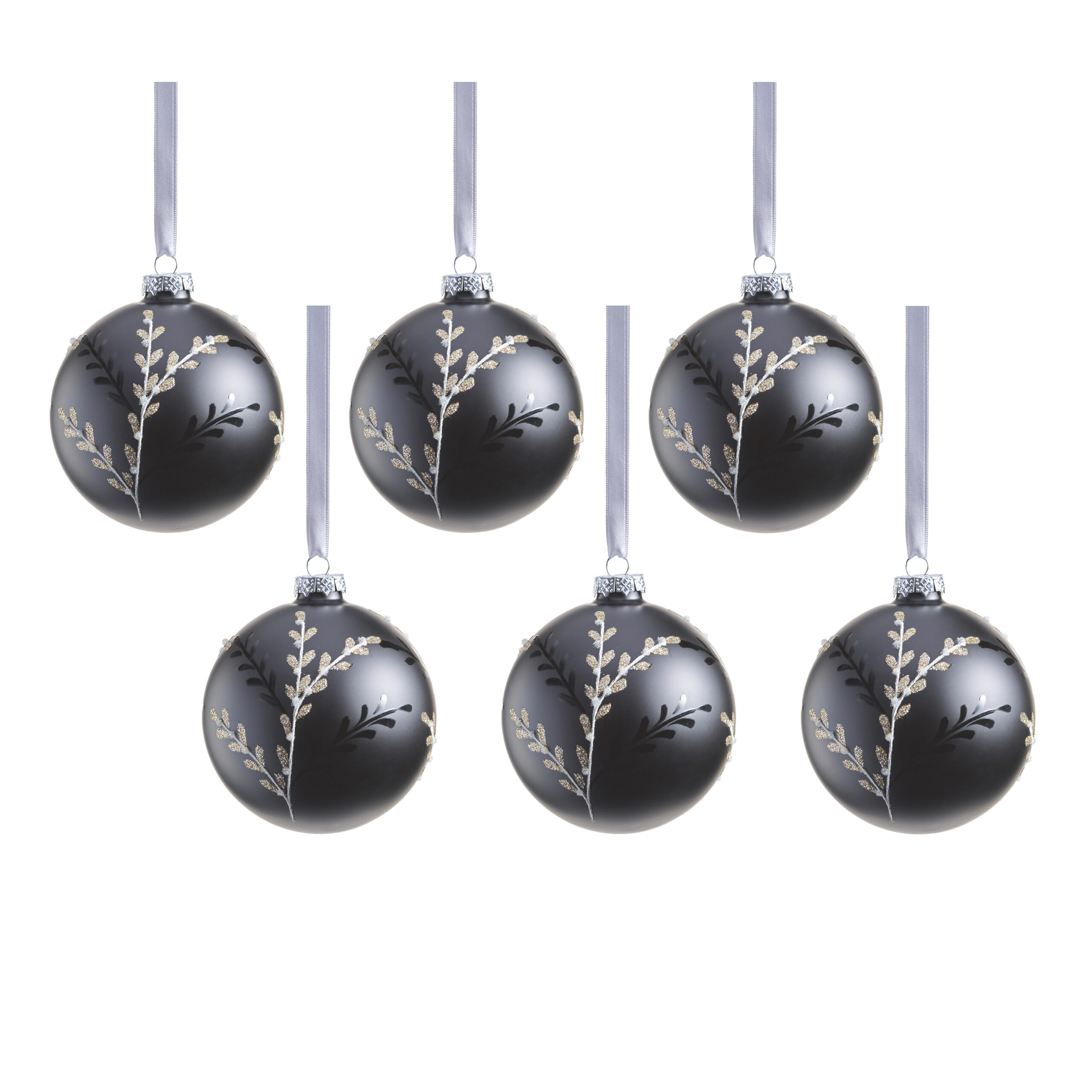 Elevate your holiday décor with our sophisticated matte black glass ball ornaments. Featuring an exquisite leaf pattern design, these ornaments beautifully combine shiny silhouette styles with glittered elements. The leaves are elegantly adorned with silver glitter, while the stems are intricately crafted with white thread, accented by tiny beads and a touch of glitter. Perfect for adding a touch of elegance and sparkle to your festive decorations, these ornaments are a must-have for the holiday season.