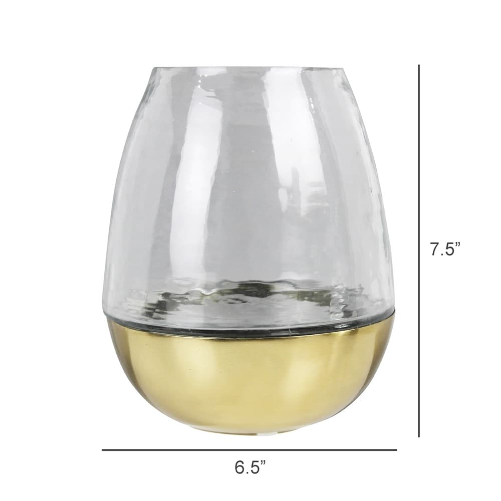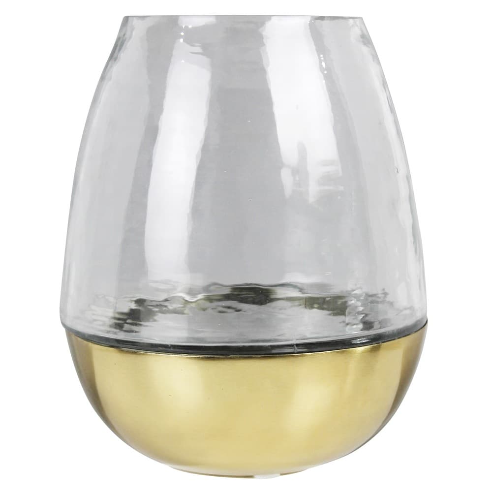 A large glass hurricane with a modern design, featuring hammered texture glass and a brass base. Ideal for both indoor and outdoor use, its sleek, contemporary style adds sophistication, perfect for creating a warm, inviting glow.