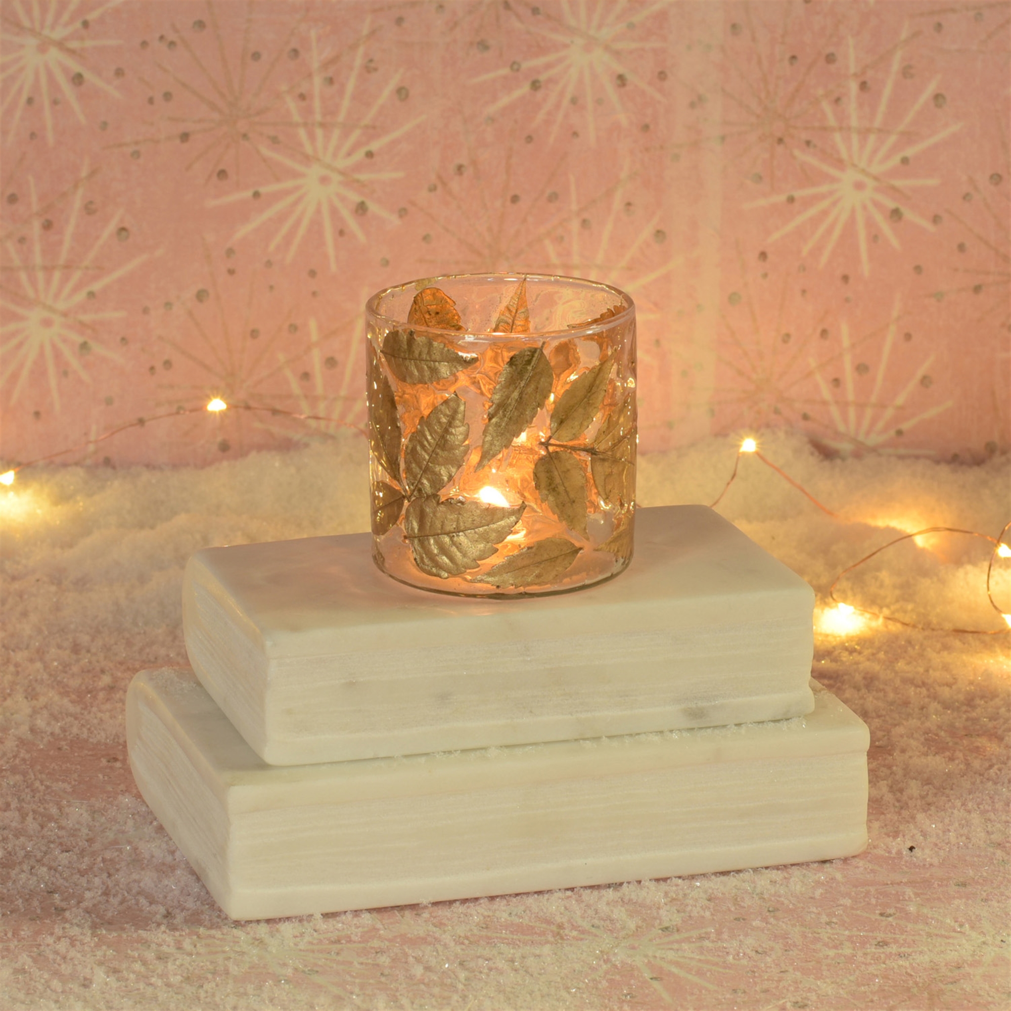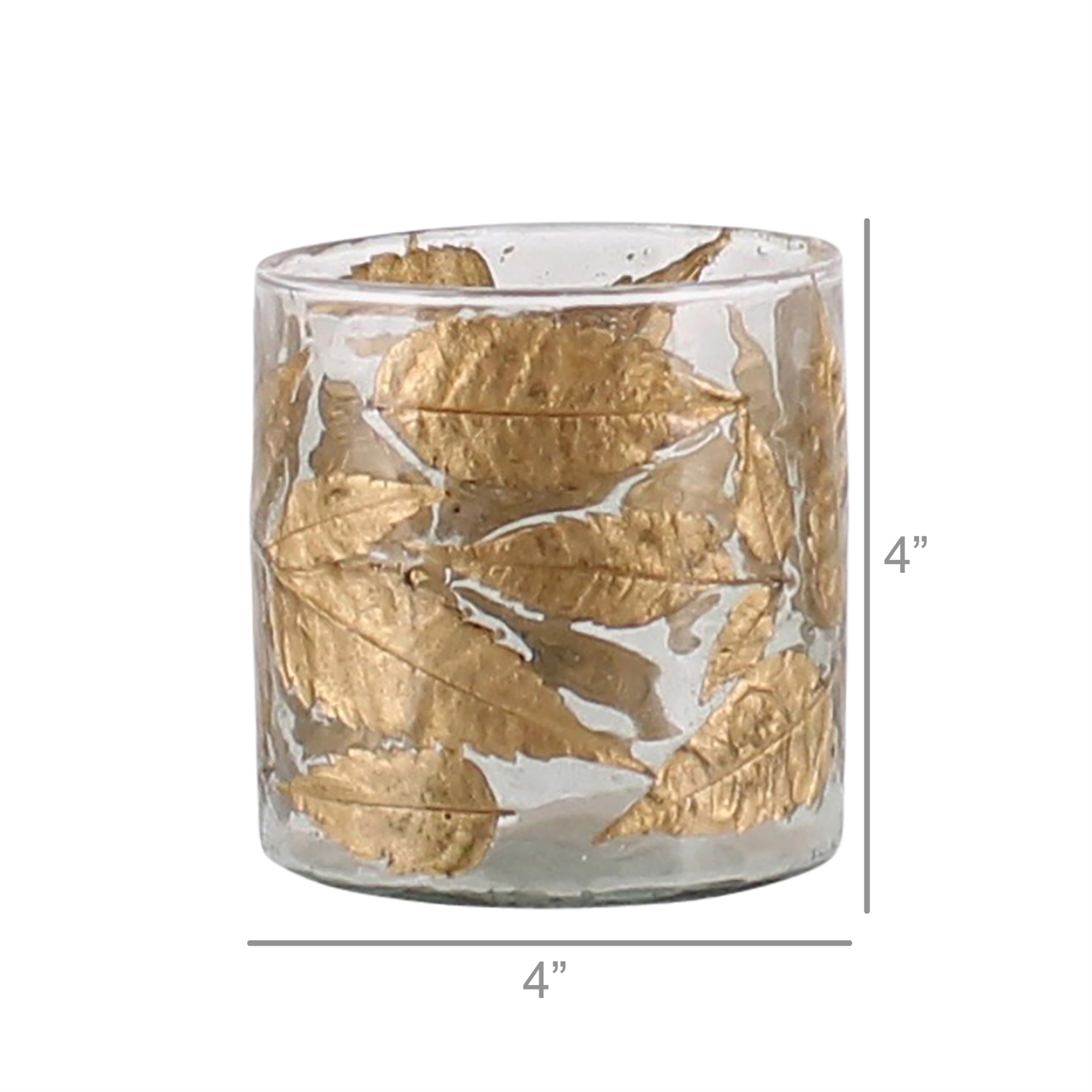 Earthen materials appropriated from nature are forever conserved in our Enamel Hurricane Collection. Gold leaves are enameled onto simple glass silhouettes presenting an intriguing luminary for a candle or flower vessel.