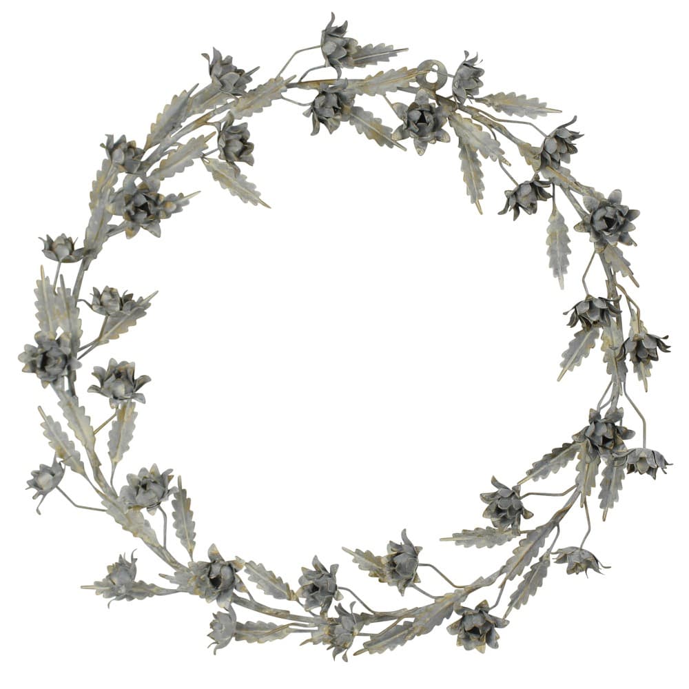 An everlasting statement piece that looks gorgeous on a door frame, above the fireplace, or even as a table centerpiece. Crafted of iron with pressed metal flowers and leaves. Whitewash finish may patina or rust if left outdoors.