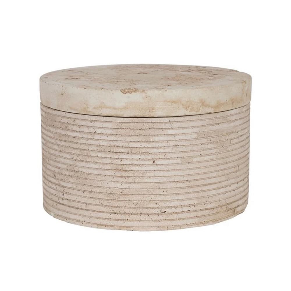 This Travertine Round Box in a soft cream color exudes natural elegance and timeless beauty. The smooth surface and subtle texture of the travertine create a refined yet rustic look. Perfect for organizing small items or as a decorative accent, it adds a touch of sophistication to any space. Ideal for both modern and traditional interiors, this box complements a variety of decor styles with its neutral, versatile tone. Available in two sizes, sold separately.