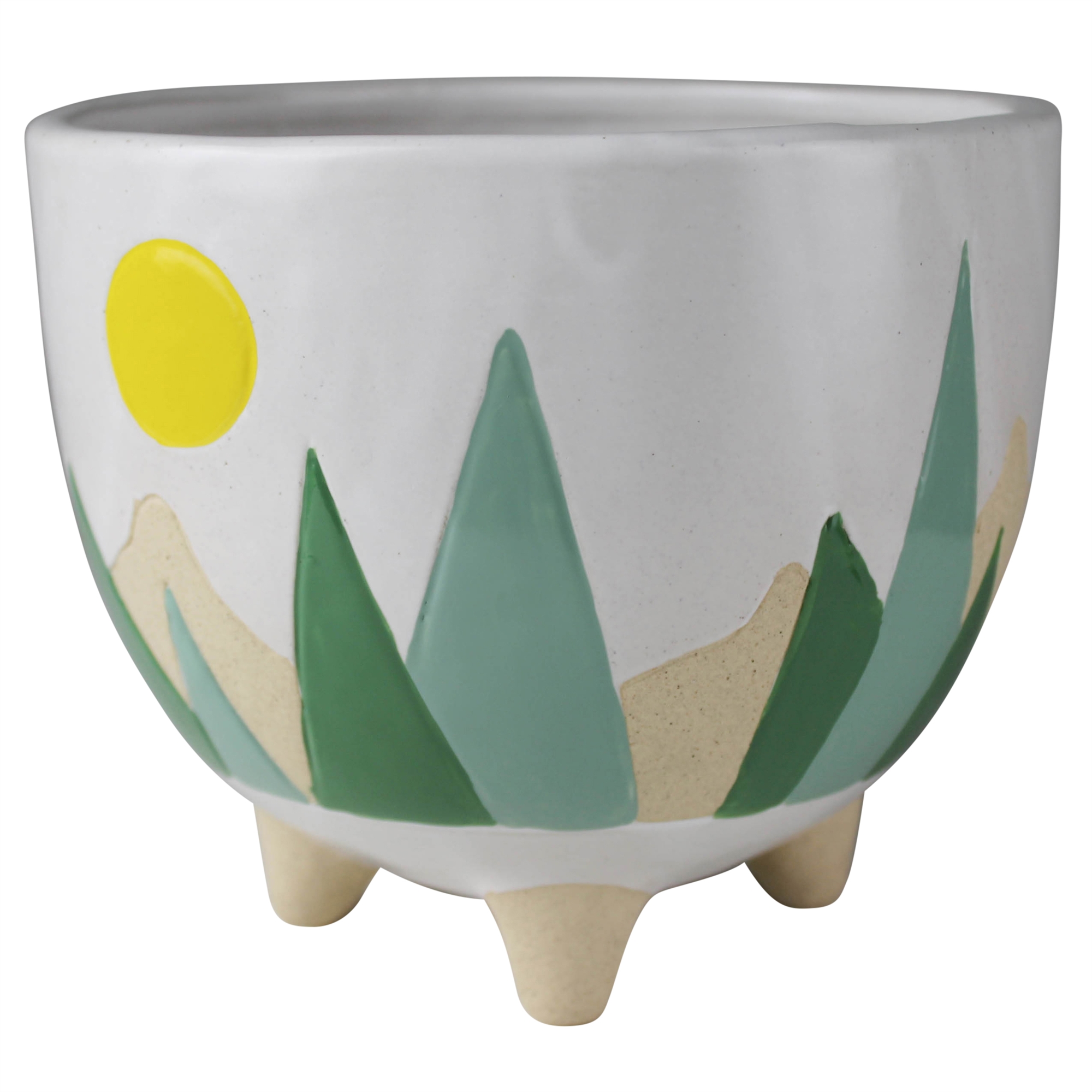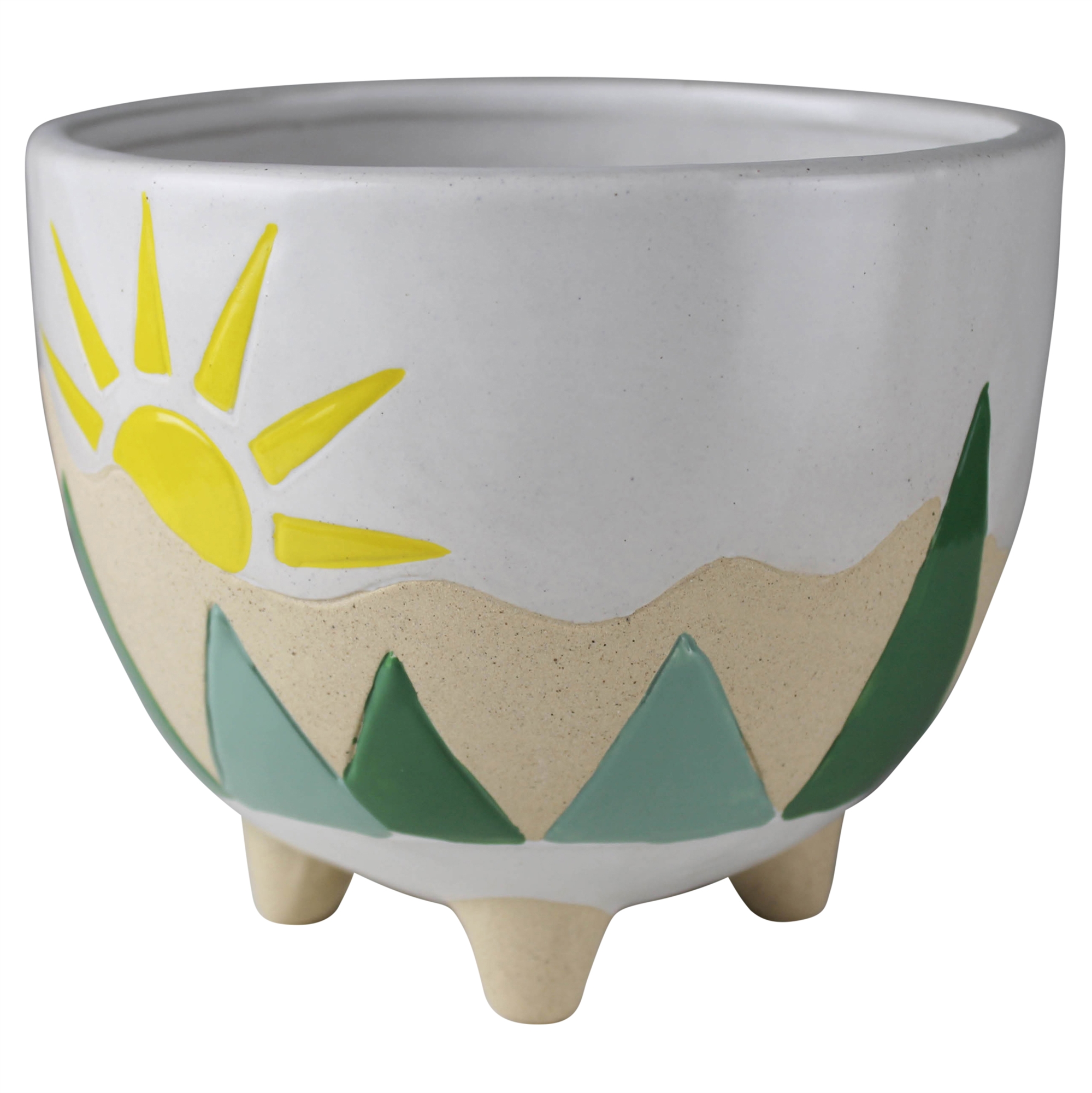 The mountains, pine trees and sun are captured 360 degrees in this unique ceramic footed vessel.