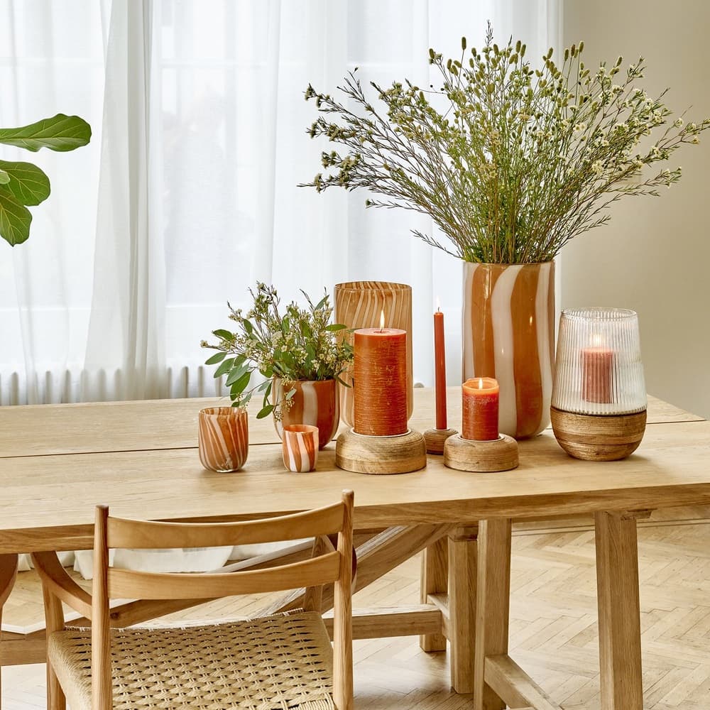 Arbre is a collection of windlights consisting of two different models: a larger ground model and a more compact table format, both also different in height. The fluted glass ‘bell jar’ accommodates a candle, creating an atmospheric lighting effect. In addition, these can also be used as a vase. Both are manufactured from mango wood and available in two colours: dark brown and natural.