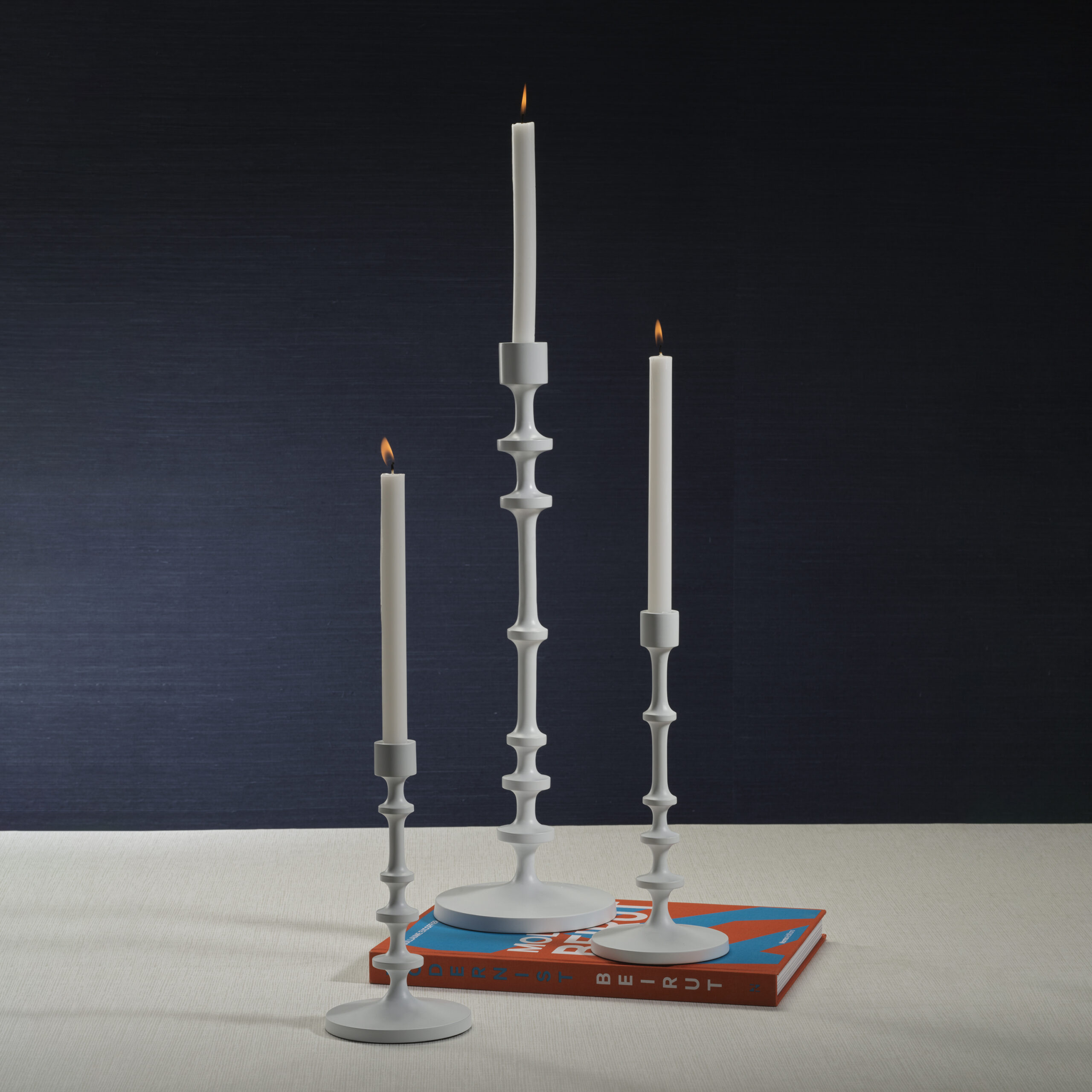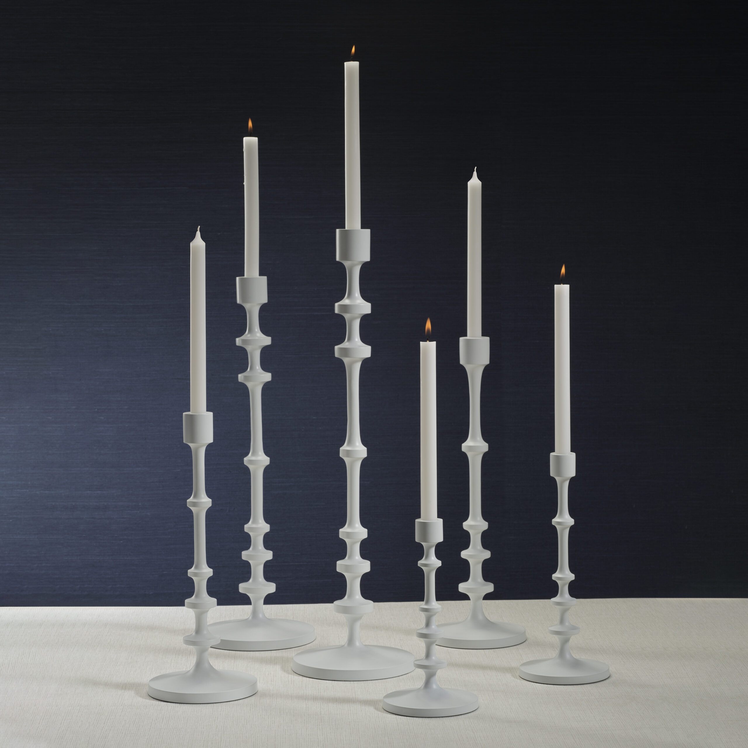 The Lilou Matt White Metal Taper Holder is a beautifully crafted piece that brings modern sophistication to any space. Made from durable aluminum and finished with a matte white powder coating, it features a distinctive blade knop-like notched silhouette. The varying spacing of the notches adds texture and visual interest, creating an elegant yet minimalist design. Available in multiple sizes, this taper holder is perfect for creating a warm, refined atmosphere with tapered candles.