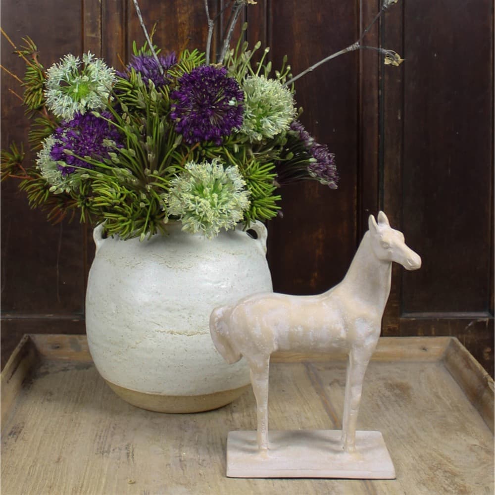 Elevate your decor with this minimalist horse, cast of aluminum with a washed terra cotta finish. This object exudes contemporary charm and elegance, perfect for adding a touch of sophistication to any setting.