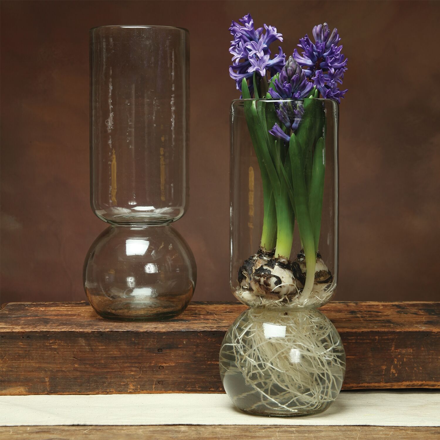 Our recycled glass bulb vase are uniquely shaped with a spherical base and a tall cylinder to aid in supporting the shoots and flowers. This clever vase is the finest way to cultivate forced bulbs (paperwhites!) indoors throughout the winter months.