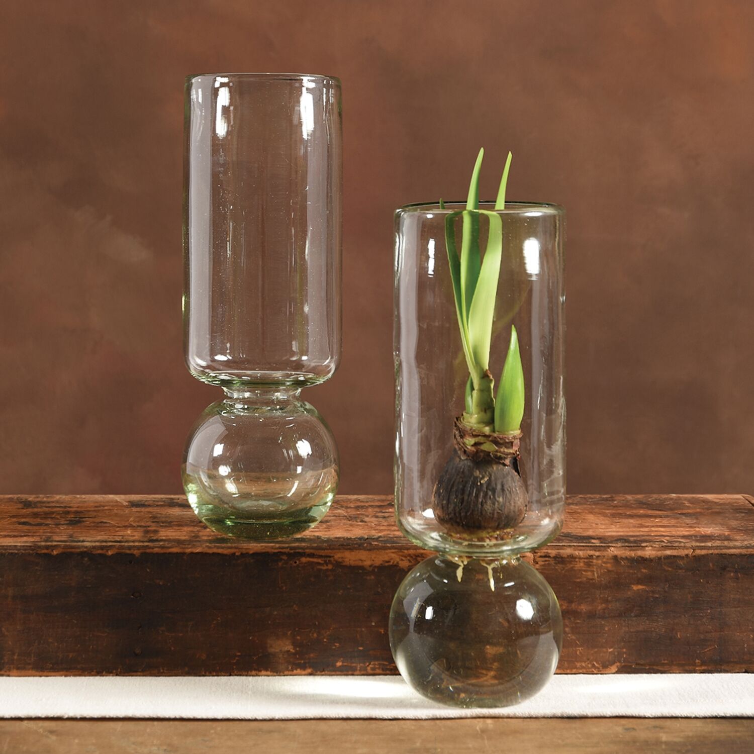 Our recycled glass bulb vase are uniquely shaped with a spherical base and a tall cylinder to aid in supporting the shoots and flowers. This clever vase is the finest way to cultivate forced bulbs (paperwhites!) indoors throughout the winter months.