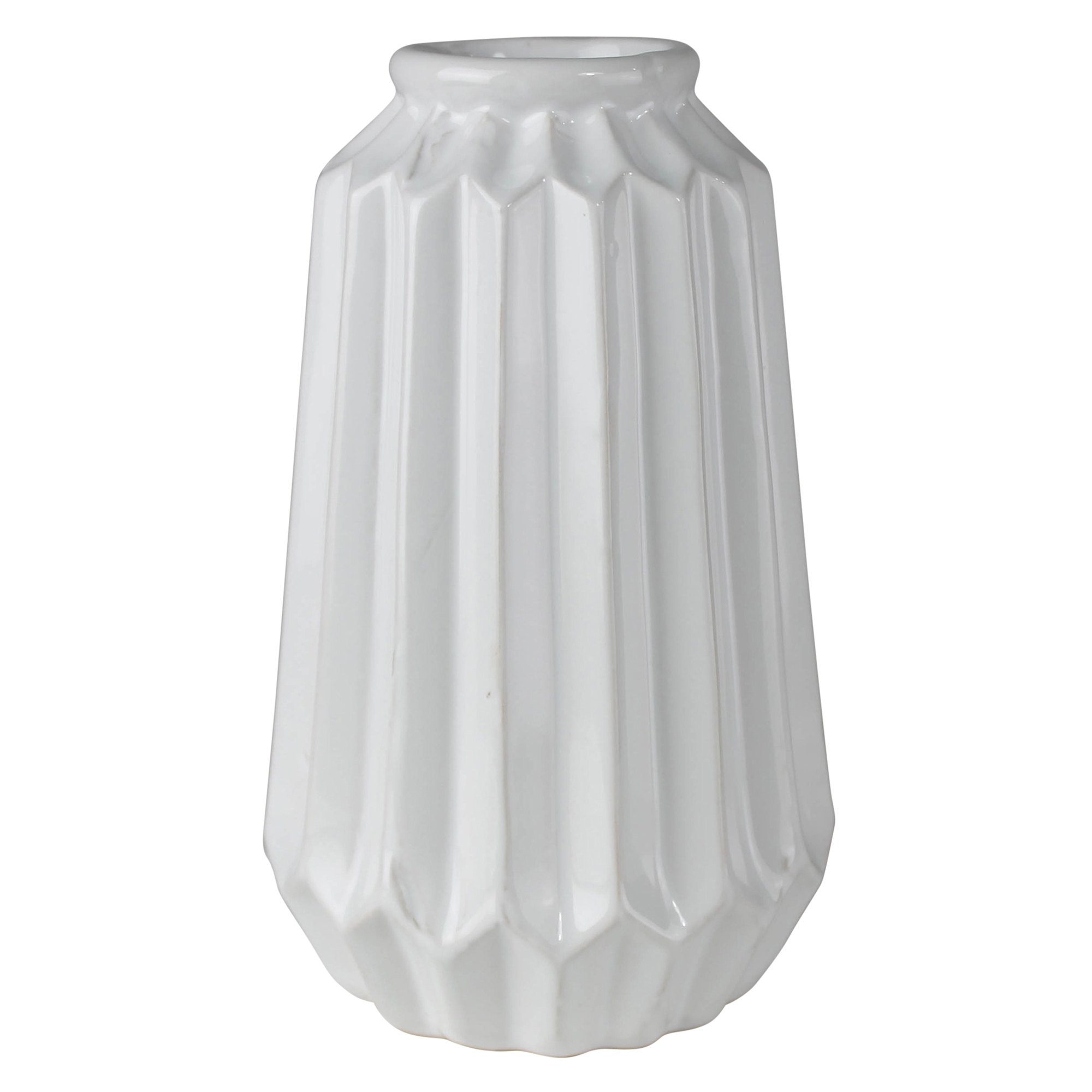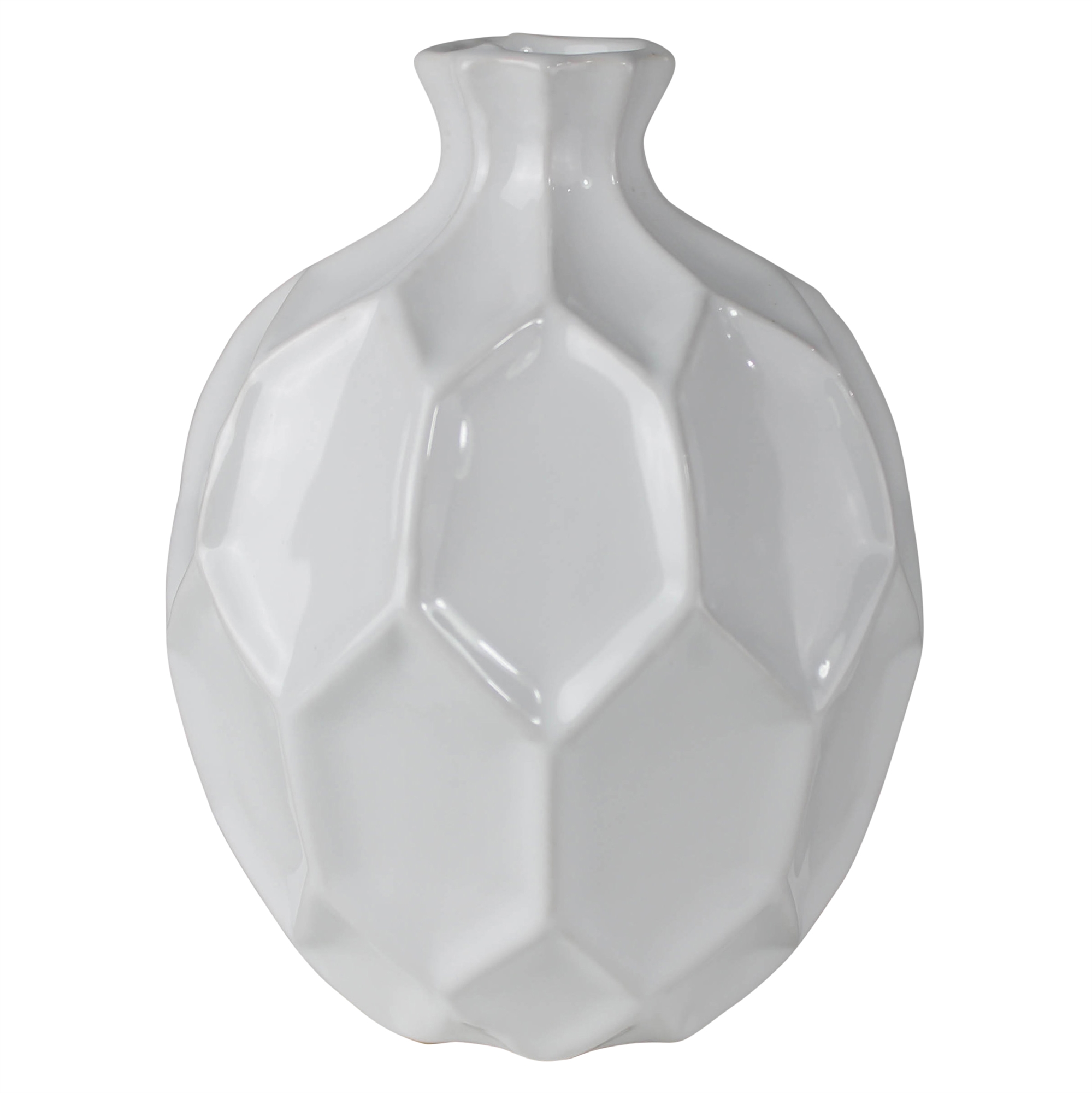 This quintet of ceramic vases each with their own distinct style unify as a singular grouping in their commonality of a glossy white glaze.
