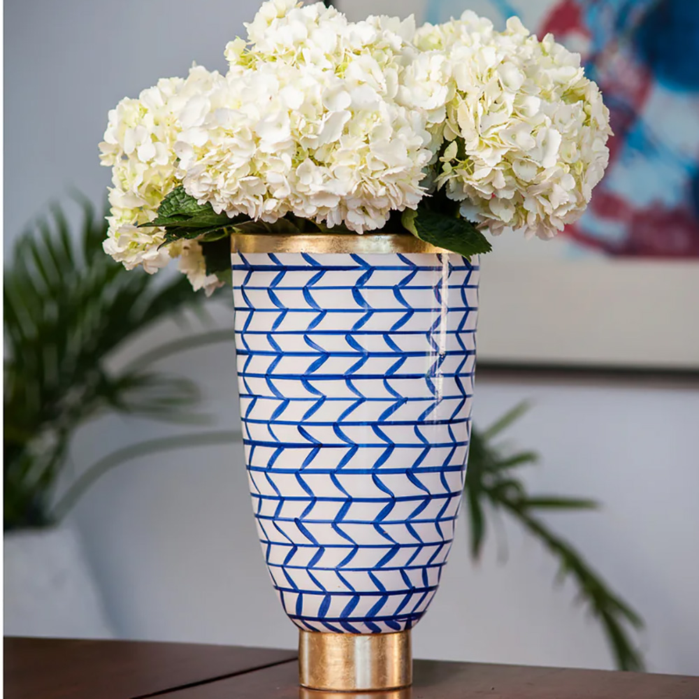 A tall, slender, stately vase accented with a crisp blue and white geometric pattern and trimmed in gold, makes a statement if filled with a bountiful bunch of blooms or simply on its own. Made in Italy.