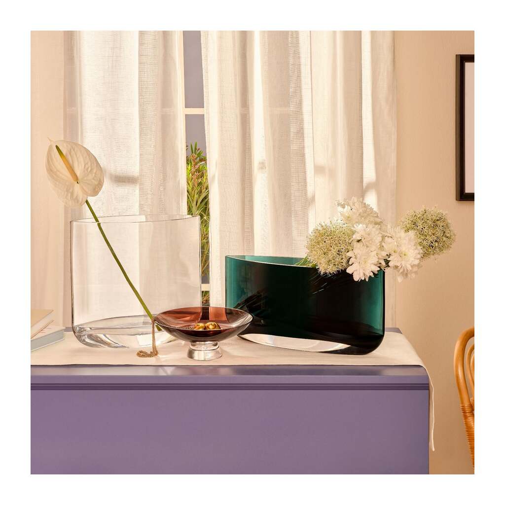 This Blade vase by NUDE offers an exceptionally creative way to present flowers. The angular yet fluid silhouette is sculpted from lead-free crystal and available in a selection of deep, transparent hues ó here in petroleum green. Made in Turkey