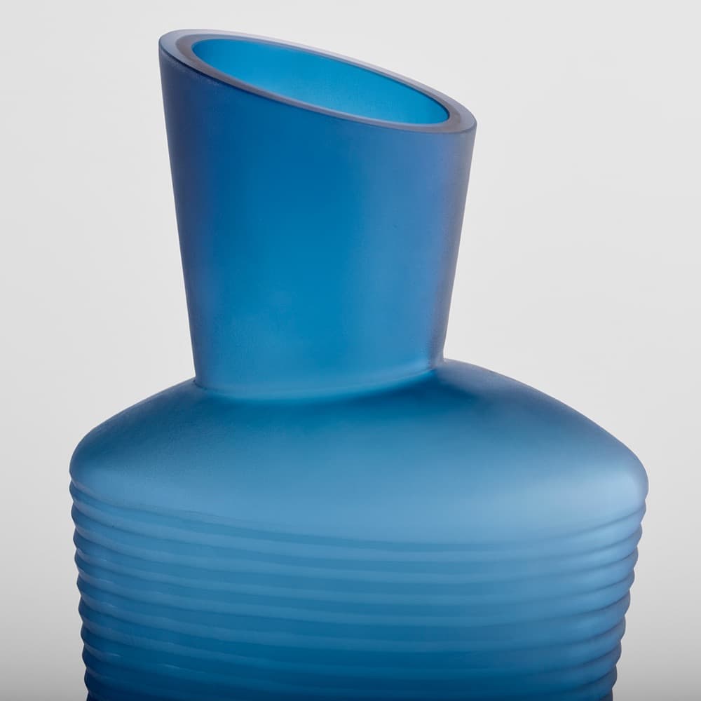 The Manarola vases command attention with their deep blue color and large-scale form, expertly crafted from thick cast glass. The vases boast crisp asymmetrical angles, indents, and openings. Each part is unique, with variations in the hand-carved ribbed detail that showcase the artistry and craftsmanship behind every creation.