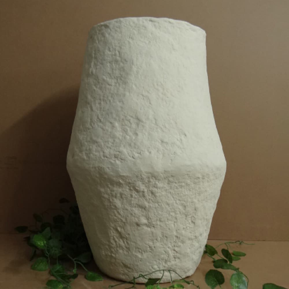 This paper mache vase, features a natural white finish that gives it a clean and elegant look. Handcrafted with care, its substantial size makes it a striking centerpiece for any room, suitable for holding large floral arrangements or as a decorative standalone piece. The vase’s unique texture and artisanal quality add a touch of rustic charm to both modern and traditional interiors.