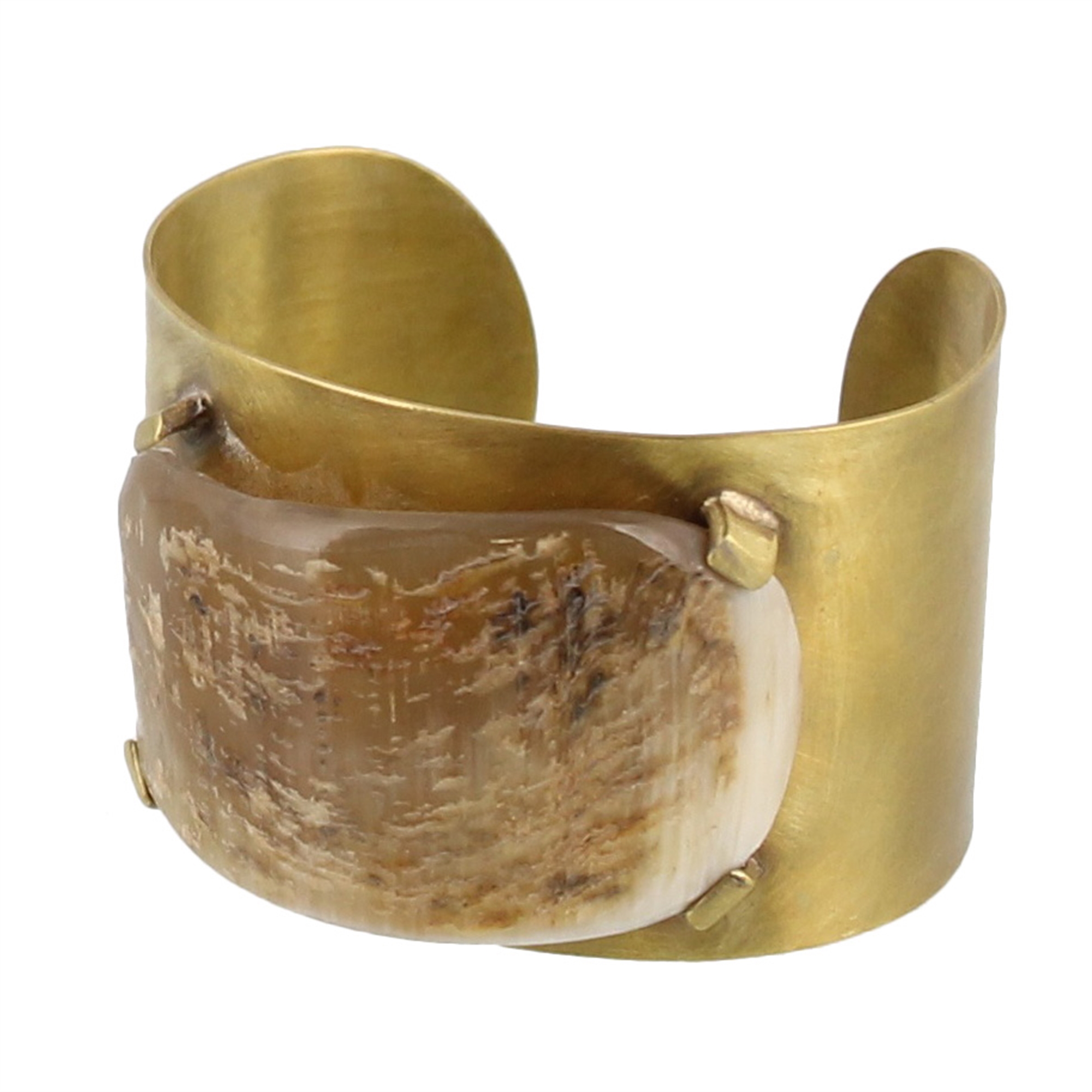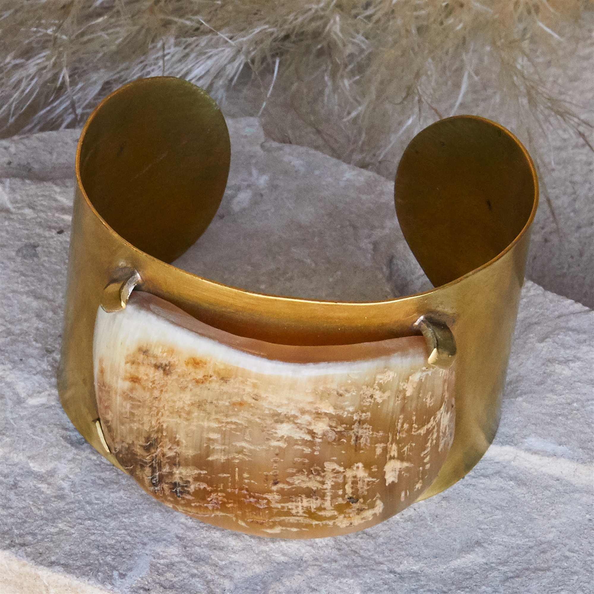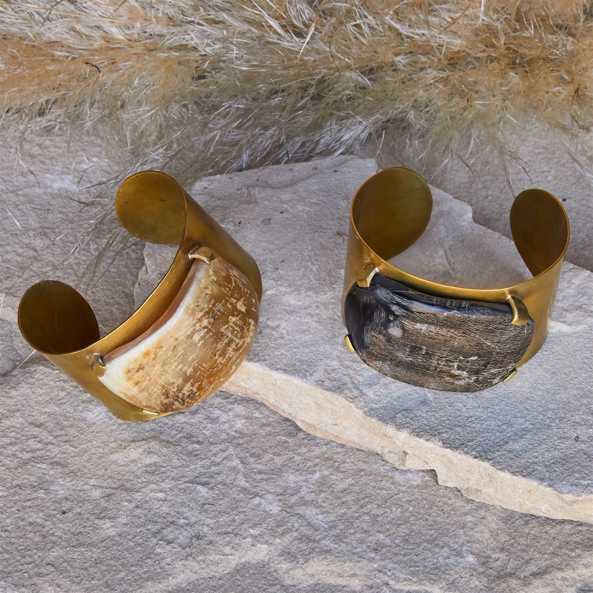 Wide brass cuffs hold natural, hand cut Water Buffalo horn in the grasp of a bezel setting. 2.5″x1.75″x2.25″