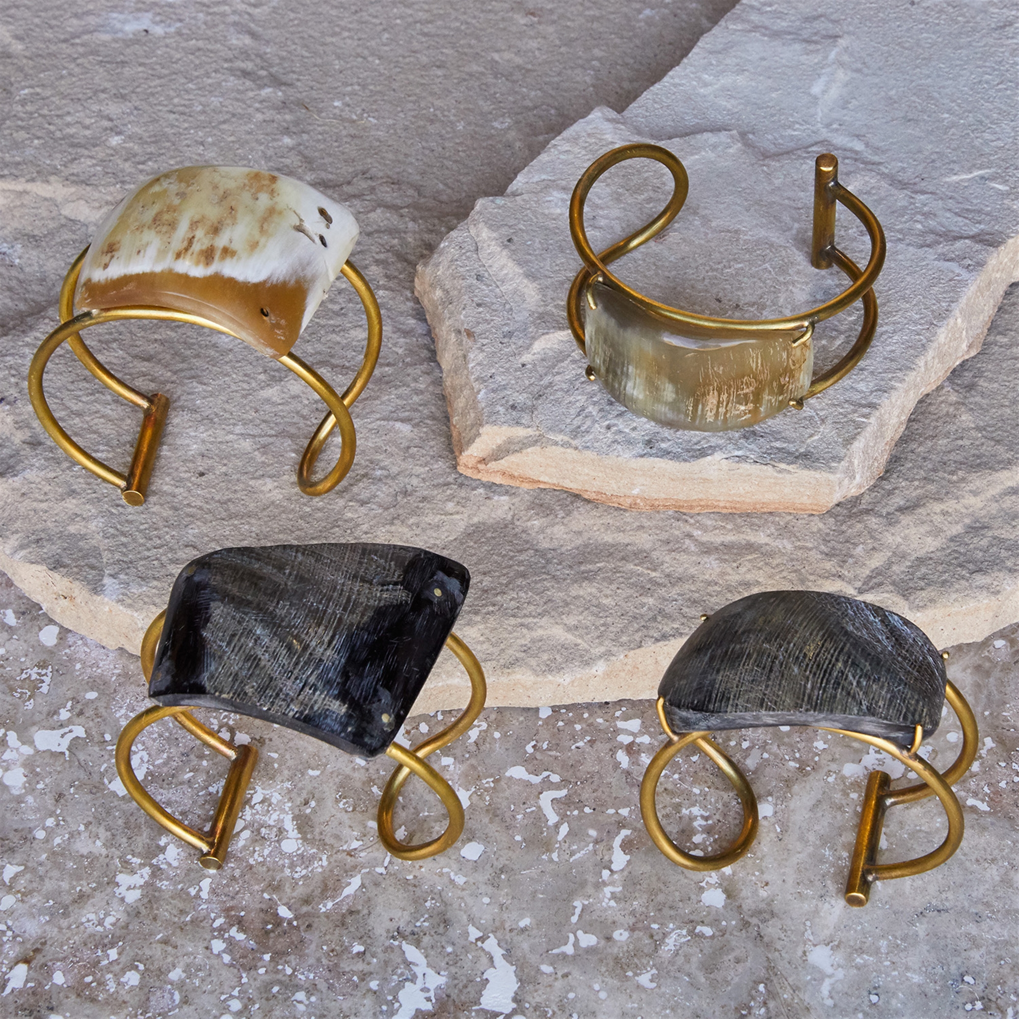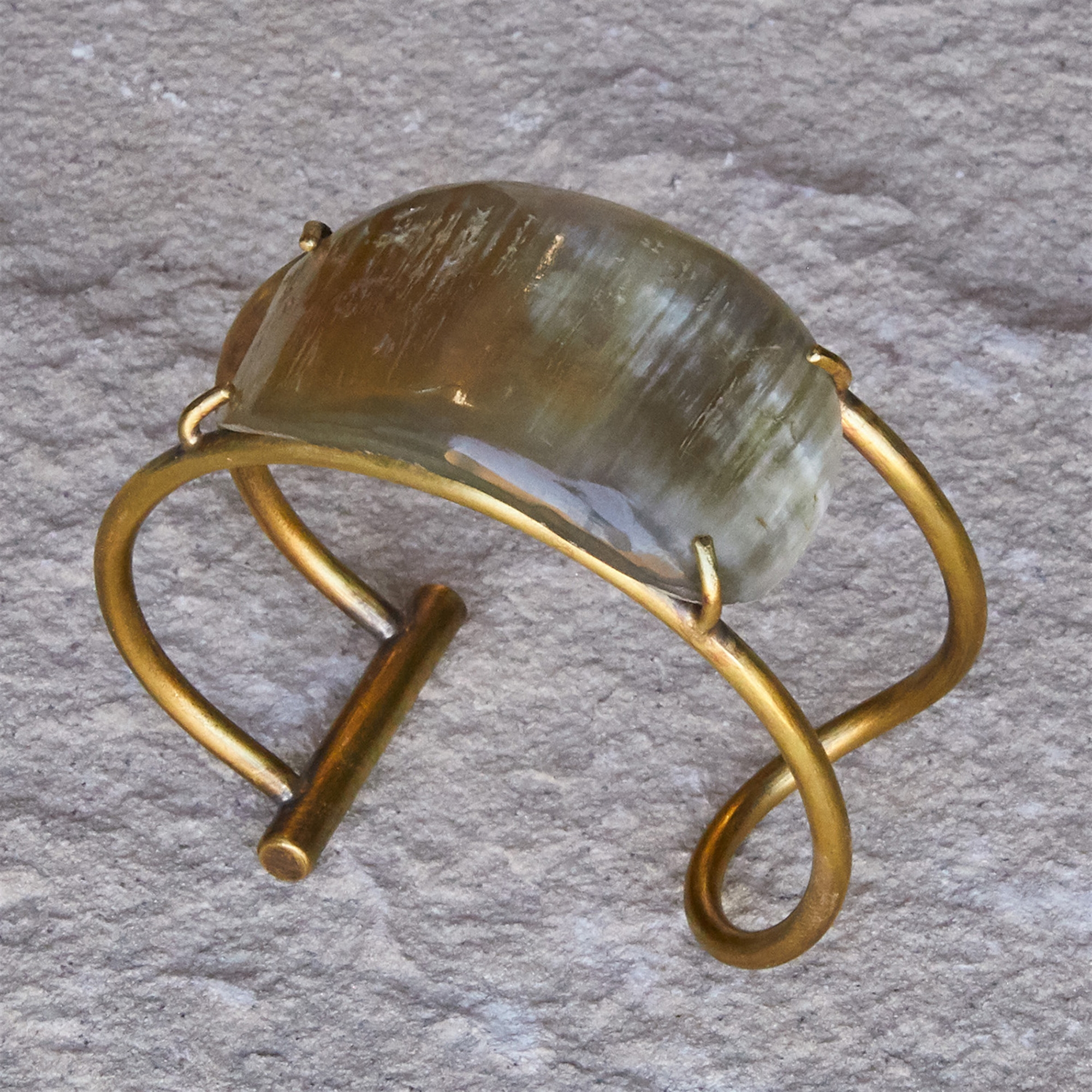 Water Buffalo horn has been hand carved in organic shapes and prong set onto a continuous brass wire cuff. 2.5″x1″x2.25″
