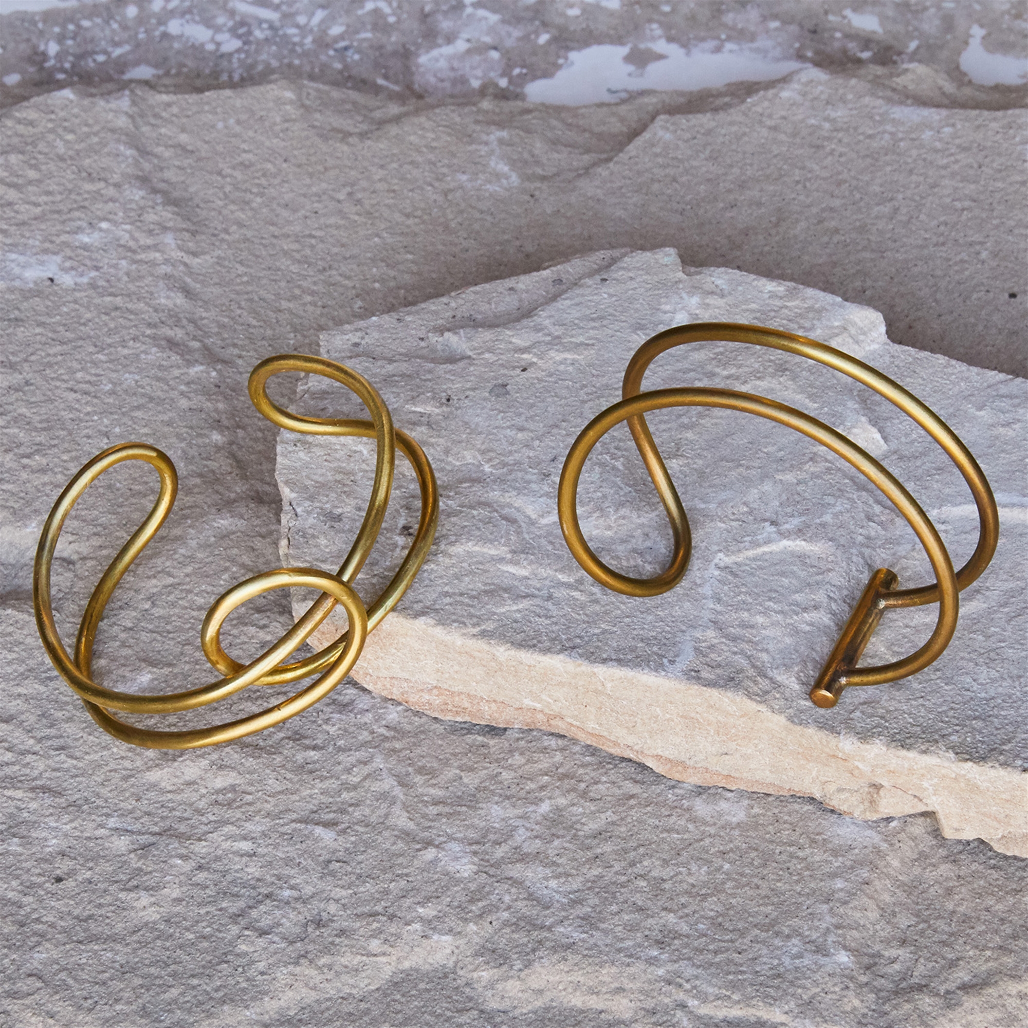 Thick, brass wire is bent and looped to create these classy, comfortable and adjustable cuffs.